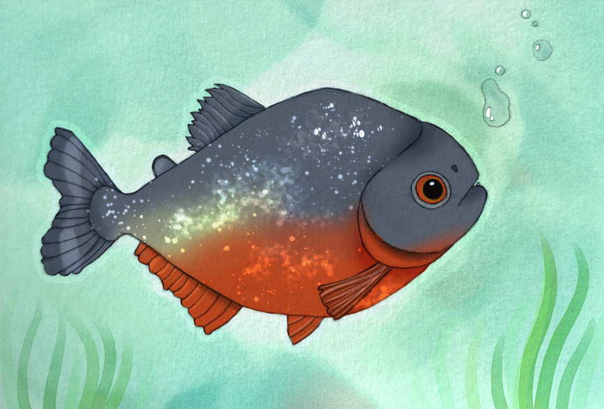 A warm up sketch that was cleaned up and colored. I've always been kind of fascinated by piranhas every since I was kid. They're such a misunderstood little fish! - Did you know? Red-Bellied Piranhas communicate through sound with various barks, grunts and croaks!