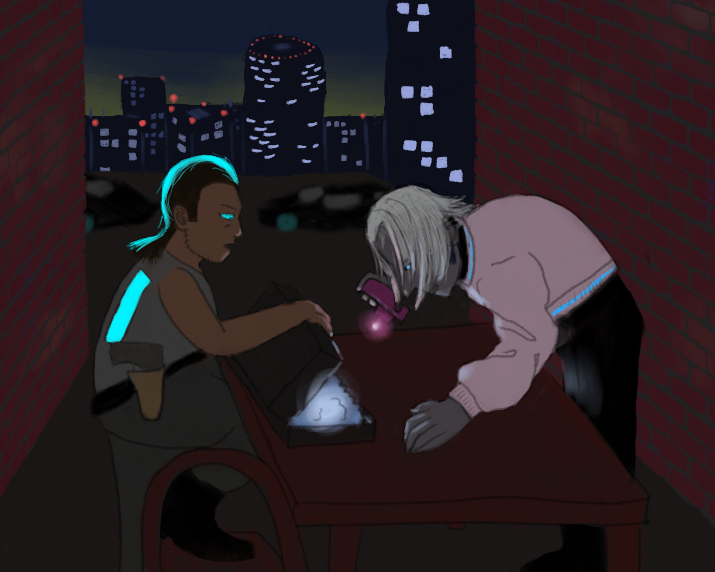 And the last of my Art Fight pieces, one with coldswap's character Alexei Petrov, and my own, Bog. I wanted to do more with this, but I went a little crazy with prep for a vending event and lost track of time. Alexei Petrov belongs to https://artfight.net/character/3058929.alexei-petrov [ID: Two characters in a brick alley, set against the backdrop of a city at night. One of them, Bog, has a glowing strip of hair back down the top of his head, and a glowing strip visible on his back. Bog is carrying a pistol, and has his foot up on a chair. He's showing the other character something glowing in a suitcase that's sitting on a table. The other character, Alexei Petrov, is bent over and examining the contents of the suitcase with some sort of mechanism that looks like a camera; it has a glowing light on the end of it. Alexei is taller than Bog with medium length light grey hair and sort of greyish skin. It's wearing a white jacket with glowing accents, and a pair of black pants with black shoes. Their visible eye is glowing a light blue color. /ID]