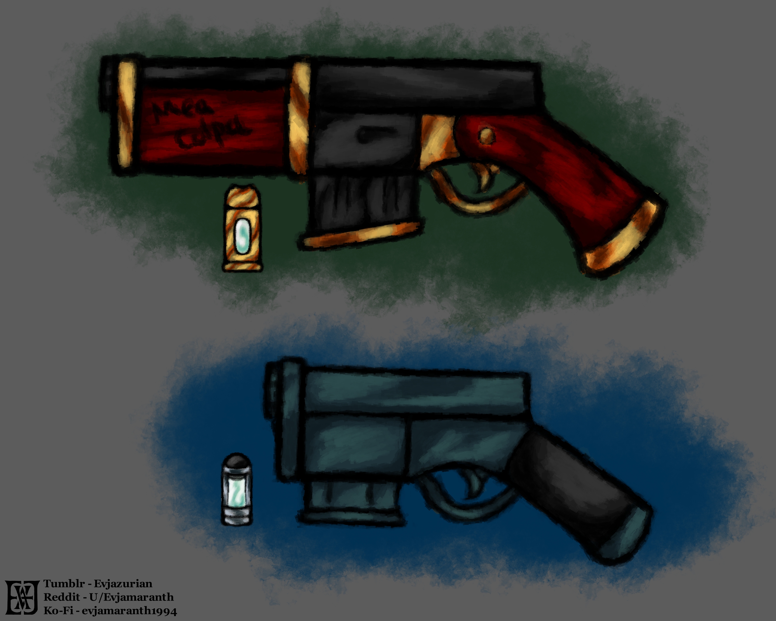 Today's chapter doesn't really have any scene that came to mind for me to draw, so I decided to draw up Robyn's gun. Mea Culpa is the gun she picked up from the sheriff, and is the gun that ended the lives of his wife and children. The "Mea Culpa" name are carved and burned by Robyn to the gun as a reminder of her action. It is a heavy caliber pistol that punches through pretty much anything, limited only by the rarity of the bullets. Currently she have one shot remaining, but she'll probably gonna get more before the end of the story. Who knows, we'll see. The Shooter is named because it's basically a pea shooter. Standard issue town guard's gun, it fires black iron balls that have poor penetrations against non-flesh materials. At least the bullets are in abundance, but Robyn definitely only rely on this as her emergency gun. Both guns uses white ichor as propellant instead of gunpowder, liquid substance that provides energy and explodes when ignited. Basically the Whale Oil from Dishonored, yes.