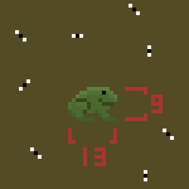 [ID: A pixel drawing of a tiny green frog, with the number of pixels he's taking up, nine by thirteen, labeled to the bottom and right hand side. Around the frog are tiny flies consisting of three pixels each. /ID]
