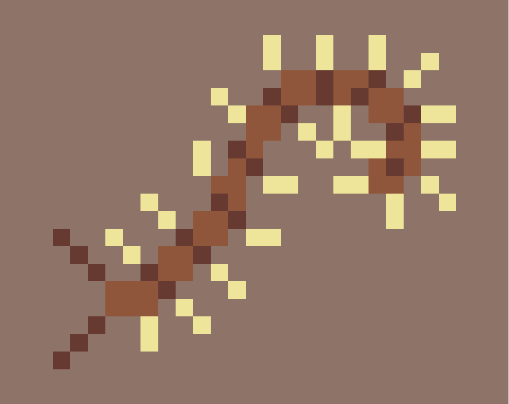 Yesterday's sketch, the smallest centipede I could manage. It was a little difficult what with all the legs, but I still like how he came out. [ID: A pixelated drawing of a brown centipede. /ID]