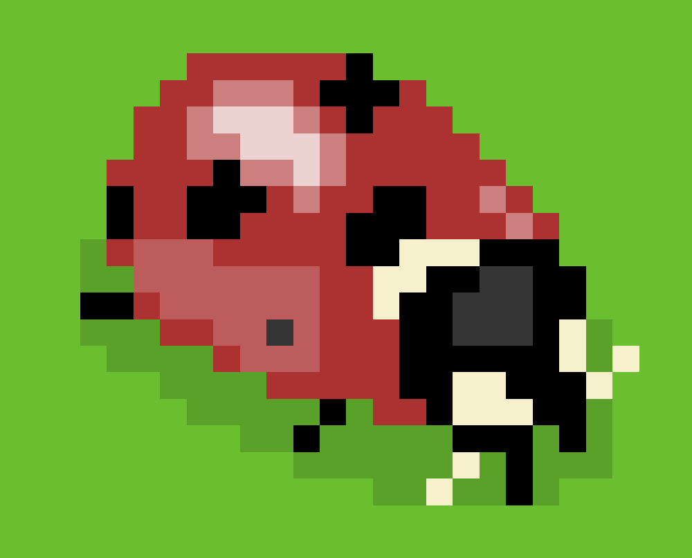 [ID: A pixelated drawing of a ladybug with simple shading against a green background. /ID]