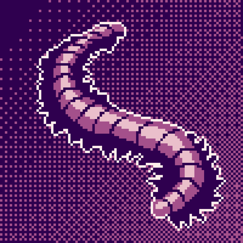 Last piece for today, the arthropleura, an extinct type of millipede. I like how it kind of wound up looking like the world's wormiest pokemon or something. [ID: A pixel art depiction of the extinct arthropod arthropleura, done in pink, purple, and outlined in white against a pixelated background. /ID]