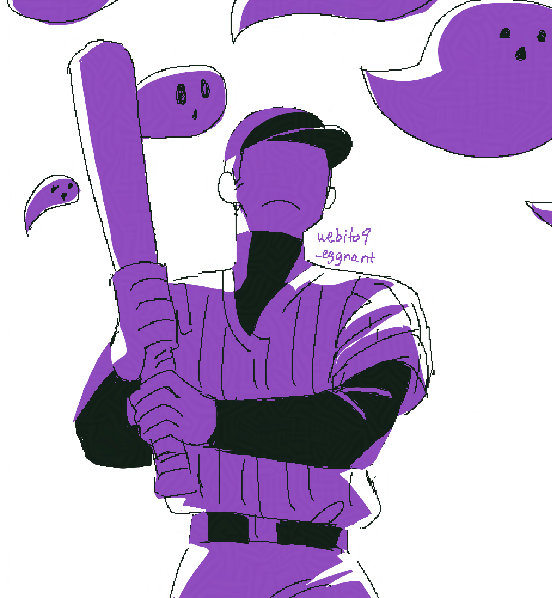 [ID: A drawing with a square aspect ratio. It represents a redrawn version of one of Mortis Ghost's doodles. It depicts the Batter, the protagonist of the videogame Off, with his trusty bat by his side, ready to swing. There are several ghosts behind him, all floating towards the right part of the picture. The batter and the ghosts are all bathed in a purple shadow, a white light hitting them on their backs. The lines are a dark green, as well as pixelated. The background is plain white. End ID]