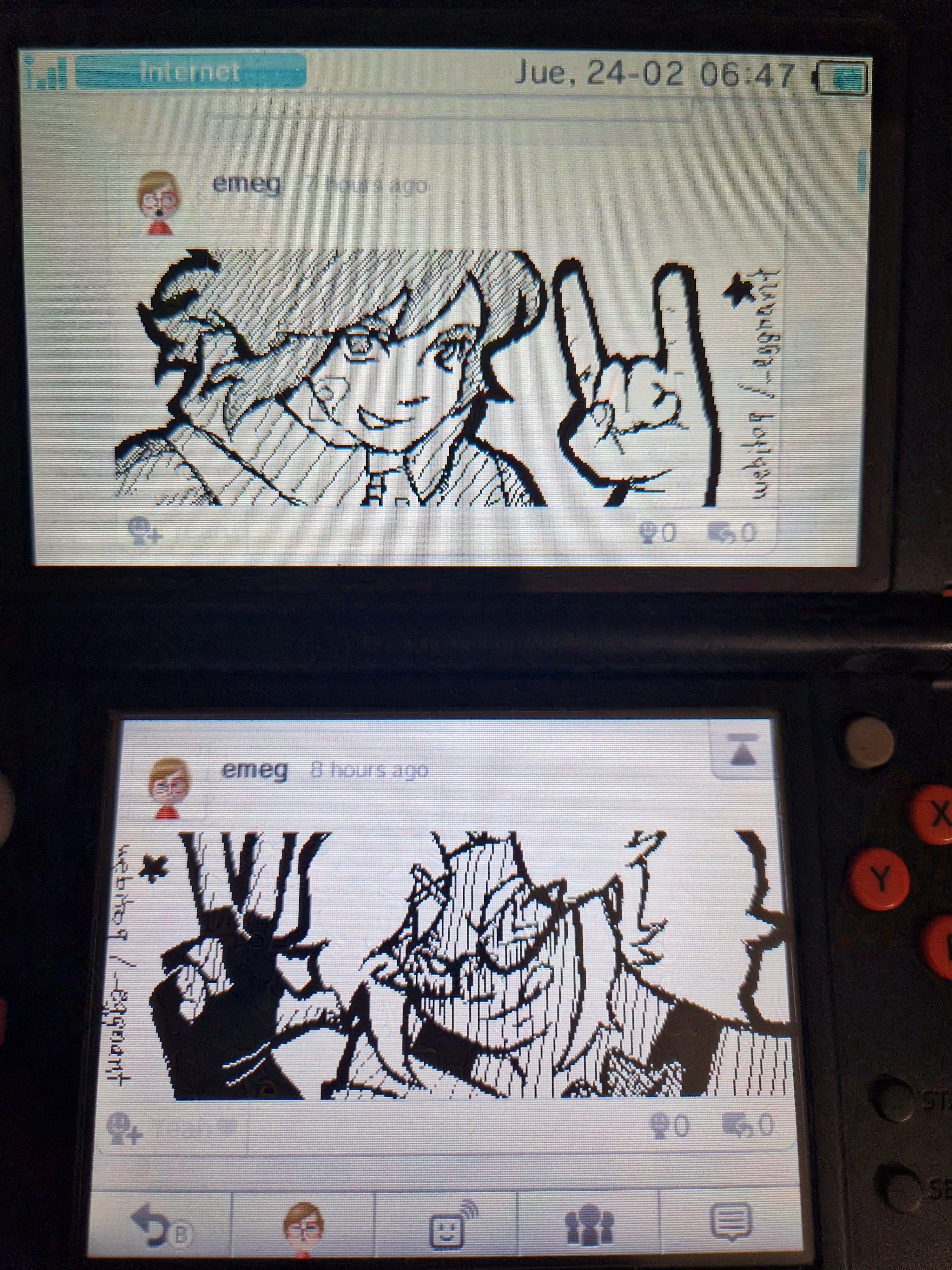 • ID: an image of a new 3ds xl. there's a monochrome drawing on each of its two screens. on the top screen, raito, one of our characters is drawn. he is a young man with light skin and dark shoulder-length hair, as well as a dark parka. he can be seen sticking out his index and pinky. on the bottom screen, tam, another one of our characters, is also drawn. she is a dark-skinned girl with long fair hair tied up in a loose ponytail. she wears a black tank top underneath a light poncho, adorned with a darker flower accessory on top of where their heart would be. she also has teardrop-shaped glasses and two hairpins that form an x on their bangs. they are making a peace sign with her right, fingerless gloved finger. they are winking. End ID.
