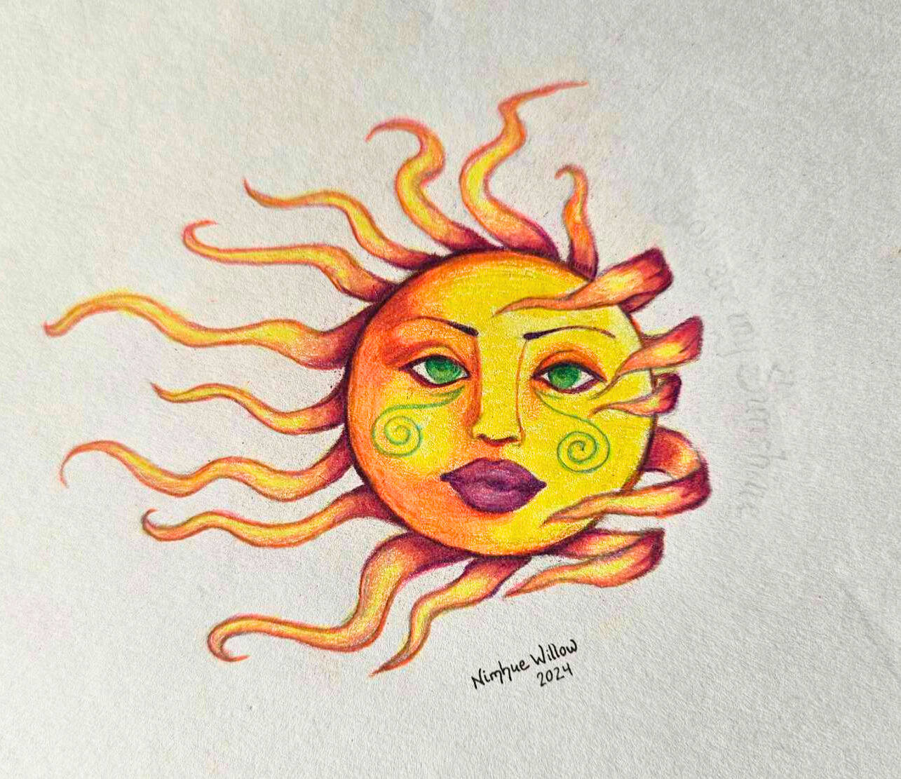_"The sun is a very magic fellow, he shines down on me each day-ay-ay-ay..." - DONOVAN_ I designed this serene sun face as a tattoo design to have done on my leg as a coverup piece for a regrettable stick-n-poke I attempted in my early teens. I did this on mixed media paper with Prismacolor colored pencils. It was enjoyable working in the highly saturated colors and I plan to do this more in works to come!