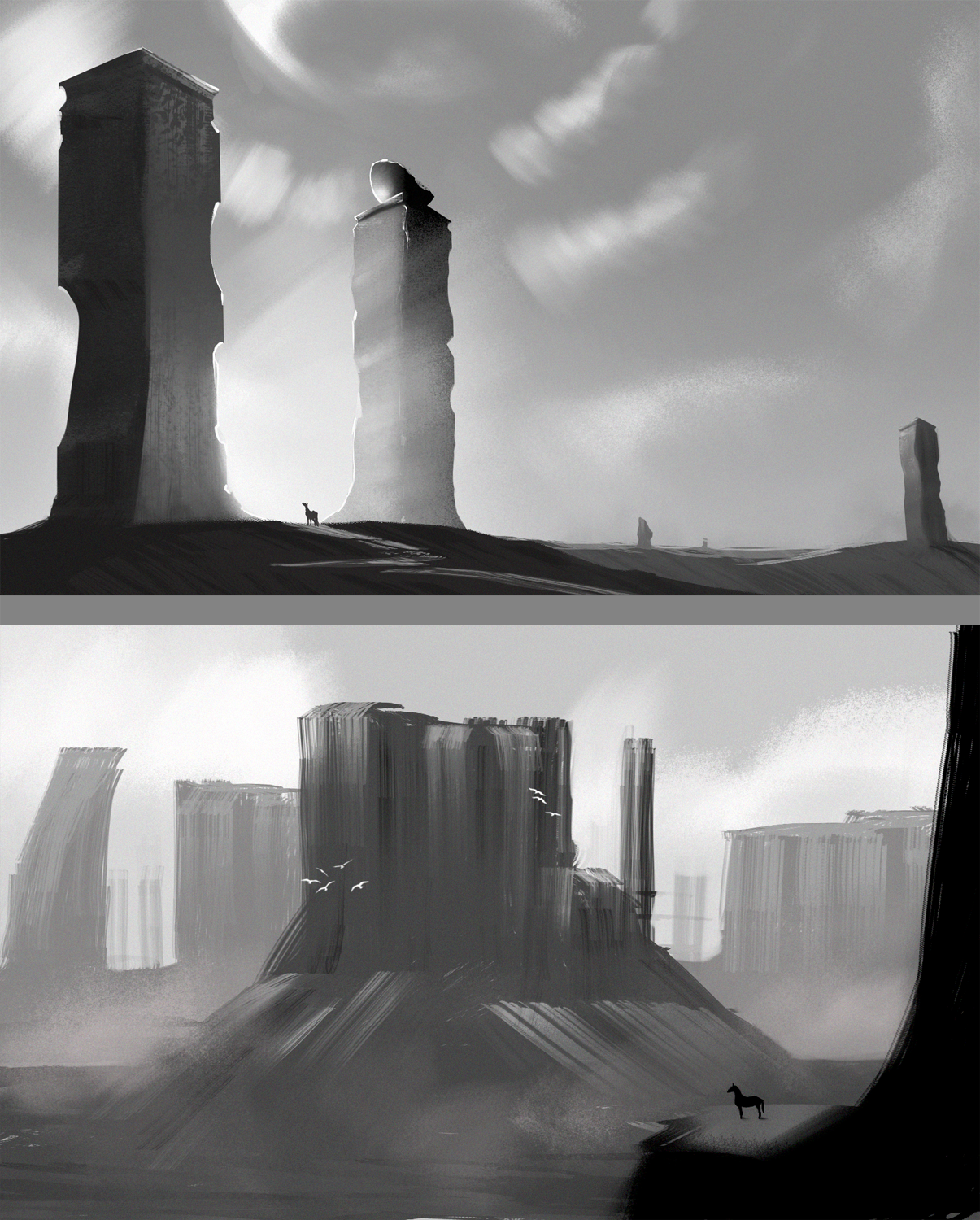 Hevos is a big world, it has all the climatic zones from deserts to tundra. Let’s see some ideas about the desert section :3 I don’t relate think Hevos has endless sand dunes (for now), it is rather that filled huge rocks kind of desert (just like in Utah.) Big mountains and endless hotness with limited water, awesome, vivid colours, clashing blues and purples with warm oranges. But it also has some warm plains, which is still rocky, but rather flat and the only big objects that are breaking the scenery up are those huge ruins. Hevos is big, it has lots of space, huge mountains and cliffs and the ruins are also massive. All the creatures have normal sizes, but their world is towering above them - just like mountains do in our world. Hevos also has lots of untamed places just yet - the population is indeed rising and the frontier is being pushed out more and more, but the world still has just enough wilderness to have space and place to wild stories and big adventures, ancient secrets and magic. The characters who live in it are still able to travel freely, but the communities who decided to stay in place and grow in numbers and thrive, making a constant home for themselves slowly reaching the edge of the wild forests and untamed mountains, discovering the secrets behind the tales and bothering creatures who rather wanna be alone, frozen in time. This doesn’t mean the communities start to build cities - we still talk about animals - but they have civilization, they have rules and borders, they learn and slowly they will exchange their mythical world to a new one, which is based on facts and not tales, where monsters are not existing anymore and maybe magic is also just another fairy tale they used to tell to each other generations ago. Hevos and every living creature in it is at the edge of progression, which serves the greater good, but still demands some sacrifices in the form of loosing the time where magic and odd creatures, tales and heroes, big adventures and legends dictated the rhythm in of the world.