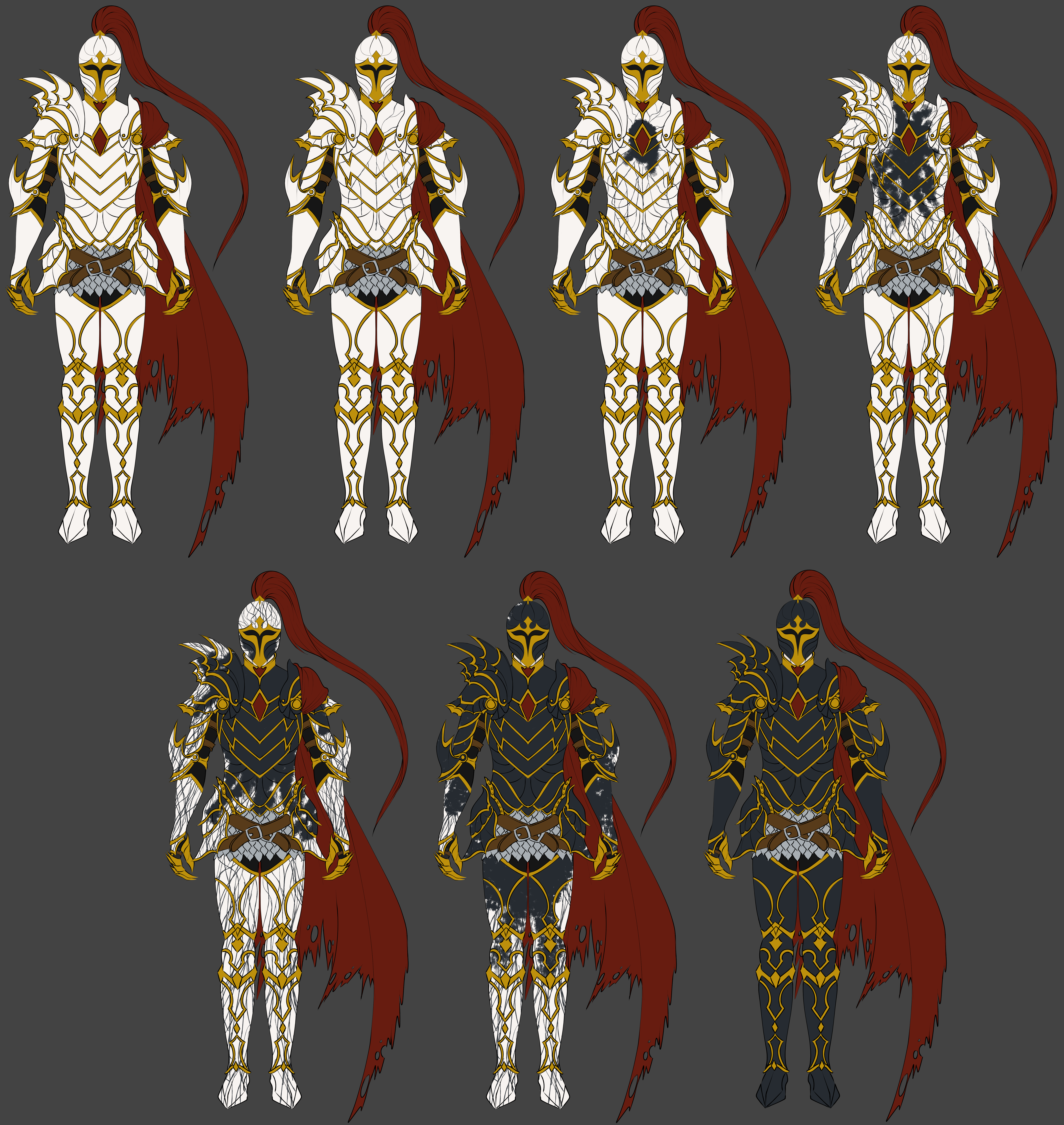 Hello! Today I finally finished the design of the armor. Since i couldn't decide between the white version (which would fit better with the character who wears this armor) and the black version (my personal preference because I'm a sucker for black-gold-red mixes) I ended up doing BOTH. My boyfriend suggested I use the white armor when Caim is in control and the black when he loses his shit. Just a shift between white and black and vice versa isn't that much dramatic, so I filled in the gaps and decided on a progression from white to black. Caim is a light user and he needs light and energy to use light both in attack and healing. over the course of combats, his energy will slowly be depleted, turning, the armor black slowly but surely. The progression is like a sickness mostly because Caim is not _only_ a light user he also has some dark secrets. If Caim's armor turns entirely black, both he and his enemies are in trouble. so normally he wouldn't let the fights drag that much, but... you never know what can happen.
