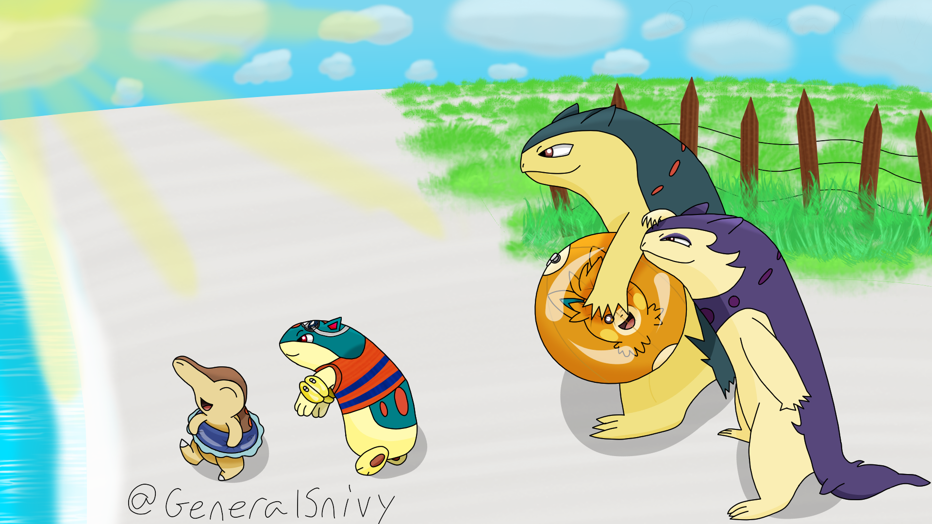 • It's a beautiful, sunny day and this Typhlosion family was trying to figure out how they could take advantage of this gorgeous day and entertain their two children. After pondering for a bit, Daddy Typhlosion came up with the idea that they should spend this day at the beach. Momma Hisuian Typhlosion agreed and then informed the kids that they were all going to spend the day at the beach. Cyndaquil and his older Quilava brother were excited and ran to grab a couple of things for their trip, which were, a little inner tube, some water wings, a pair of swimming goggles, and a life jacket, just to be on the safe side. Daddy Typhlosion also brought a big Pawmot beach ball for the kids to play with once they finished swimming in the ocean and were ready to get out of the water. Needless to say, it was a fun day under the sun for everyone and everyone had a blast swimming in the ocean, relaxing under the sun's rays in the soft, white sand, and playing with the beach ball by passing it around to one another and bouncing it around. Thankfully, the ball never fell into the ocean, which otherwise would've been swept away by the ocean's currents, which would've made both Cyndaquil and Quilava sad.
