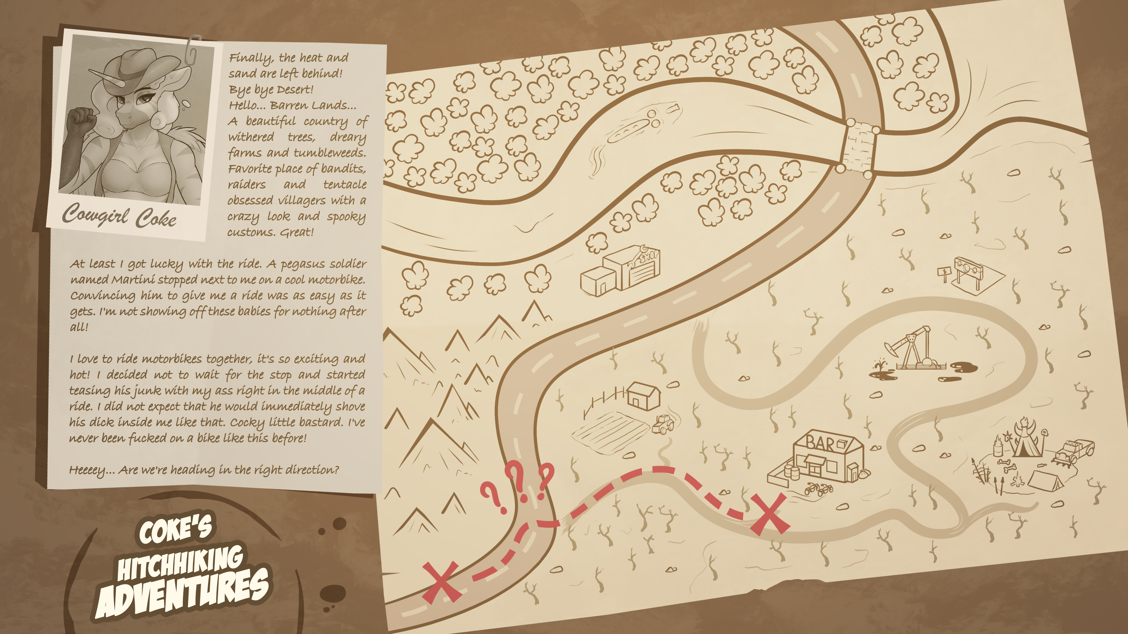 Finally, the heat and sand are left behind! Bye bye Desert! Hello... Barren Lands... A beautiful country of withered trees, dreary farms and tumbleweeds. Favorite place of bandits, raiders and tentacle obsessed villagers with a crazy look and spooky customs. Great! At least I got lucky with the ride. A pegasus soldier named Martini stopped next to me on a cool motorbike. Convincing him to give me a ride was as easy as it gets. I'm not showing off these babies for nothing after all! I love to ride motorbikes together, it's so exciting and hot! I decided not to wait for the stop and started teasing his junk with my ass right in the middle of a ride. I did not expect that he would immediately shove his dick inside me like that. Cocky little bastard. I've never been fucked on a bike like this before! Heeeey... Are we're heading in the right direction?