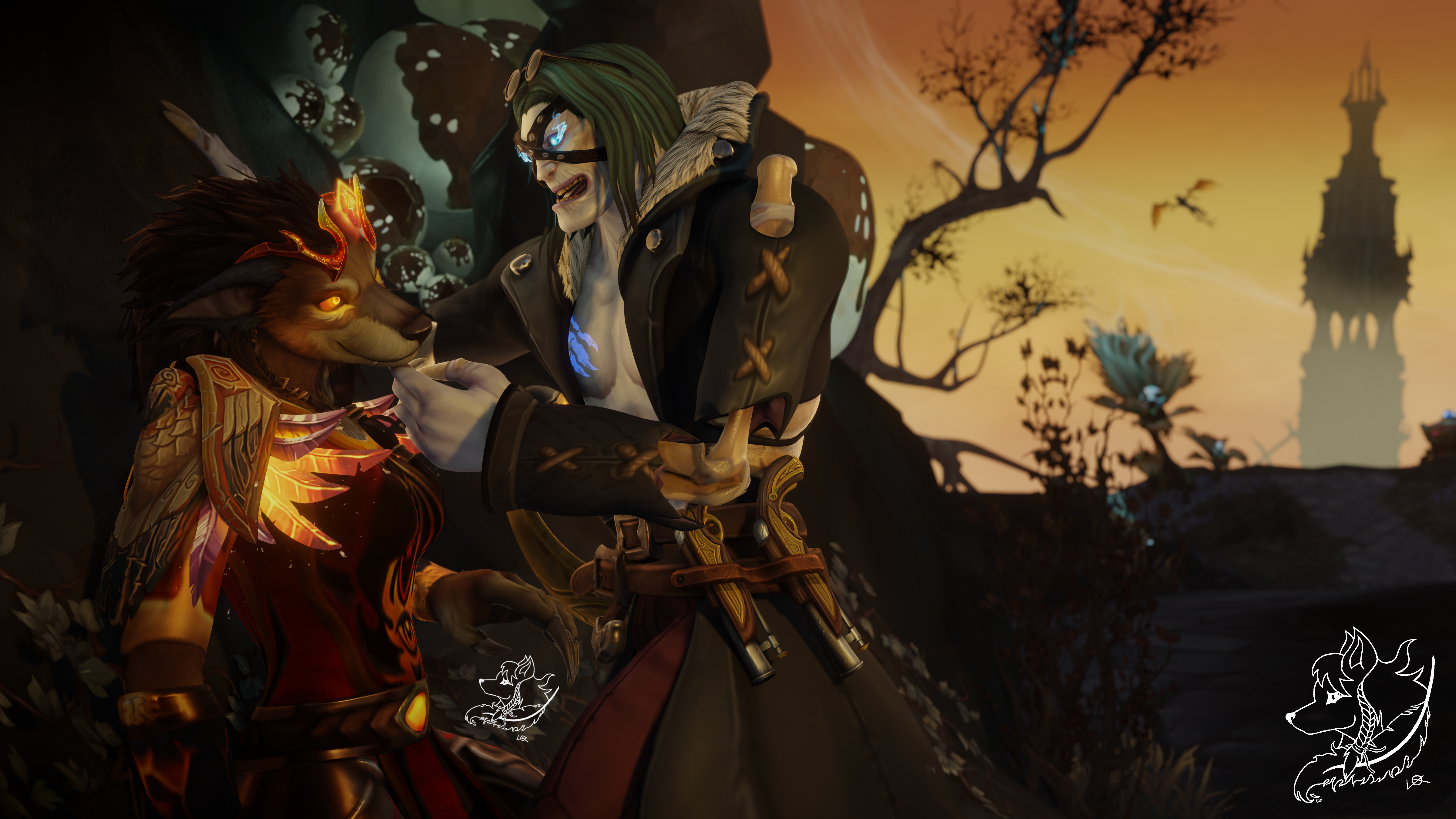 **This piece was originally completed and published to DeviantArt on Oct 5, 2021.** _"The Worgen Huntress realized a moment too late that she was being followed. Within mere seconds, the tall mysterious stranger instantly appeared out of nowhere. In a passionate manner, he snatched her around and carefully pinned her back slightly against the rocky ivy-covered tunnel wall. He gently placed a long, gnarled index finger under her furry chin to subtly shift her gaze up to his. "Fancy meeting you here," he said eagerly with a delighted grin. Pheonixx could feel herself blushing as she shyly tilted her canine-like head in a flirtatious manner. This mysterious stalker was no stranger at all, but in fact her beloved husband, Sneaky Pete."_ Every time I ride through the secluded tunnel in Korthia; I naturally imagine Pete and Phe undoubtedly having a secret rendezvous there. Initially, a different camera angle was tentatively planned for a more private and enclosed feel. Ultimately, that idea was scrapped for I wanted to indicate a more proper understanding of the scene's location. The glowing mushrooms are my own doing, as they do not glow in-game. I sincerely feel as if this was a missed opportunity for Blizzard to add a little more personality to the fungi of Korthia. There is, after all some other plant life in the area that does give off a gentle glow of sorts. I primarily produced this to shake some of the rust off that might have possibly formed during the turbulent month and a half-long struggle with my last artwork. The art itself isn't what inadvertently caused the personal struggle, but the mental state I was in at the time. My mental state is indeed healthier, but even this specific piece took longer than it should typically have. There are 3D WoW Blender artists, who are just as good as I am if not more superior. They produce 4 to 5 works in the time it typically takes me to make one single piece. This disheartens me to no end, as there are so many creative ideas floating around in my overactive brain, and I can't get them out fast enough. Someone indicated this piece has a Halloween feel, I do agree as Korthia gives off autumn vibes.