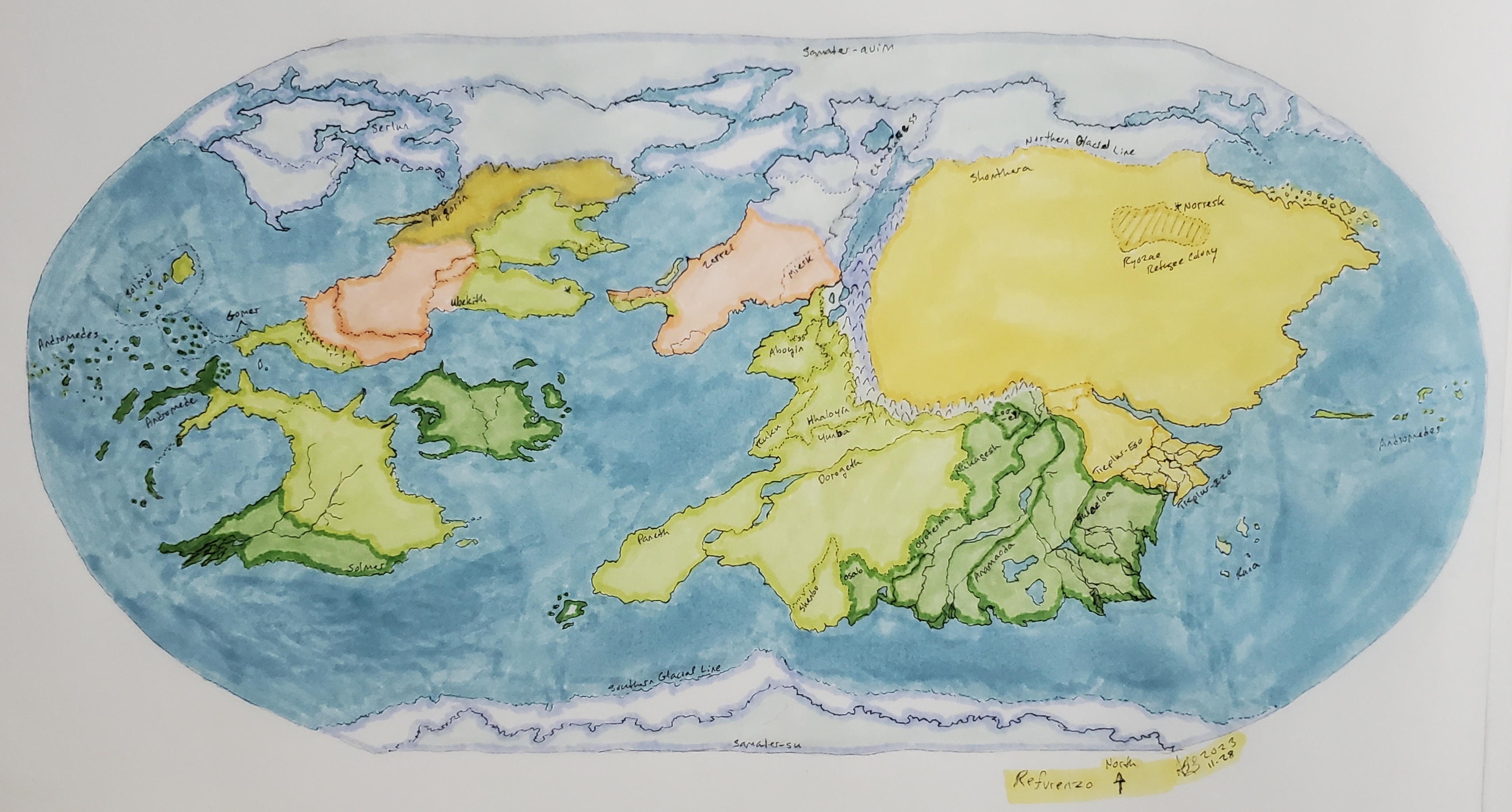Prismacolor marker on Bienfang marker rag paper. Not sure how I feel about the paper. I'm a bit dyslexic, so while I did manage to hide/incorporate most of my mistakes, I also got myself mixed up on one notable occasion, so that's why there's an inconsistent dark yellow area. Yellow: Rocky Desert Orange: Sandy Desert Purple/Green: Icy desert, Snow, Cold Purple/White: Glacial regions Light Green: Grasslands, Steppe, and Temperate Forest Dark Green: Tropical Forests and Wetlands Not pictured: Brutally cold regions in the north often covered in ice and snow. Mostly over that big yellow region to the West. This is a lot of fun to do because every line tells its own story, sometimes geological/environmental stories, and sometime geopolitical ones. You start to imagine where conflicts might occur over land rights and resources, or where alliances may lie. There just isn't enough time in the world to tell them all! (Although if I could do this for a living, I would certainly try!) Refvrenzo is one of several planets from The Ryozae Alliance series. Book 1 [now uploading](https://www.royalroad.com/fiction/61294/alliance-the-ryozae-alliance-book-1) on Royal Road.