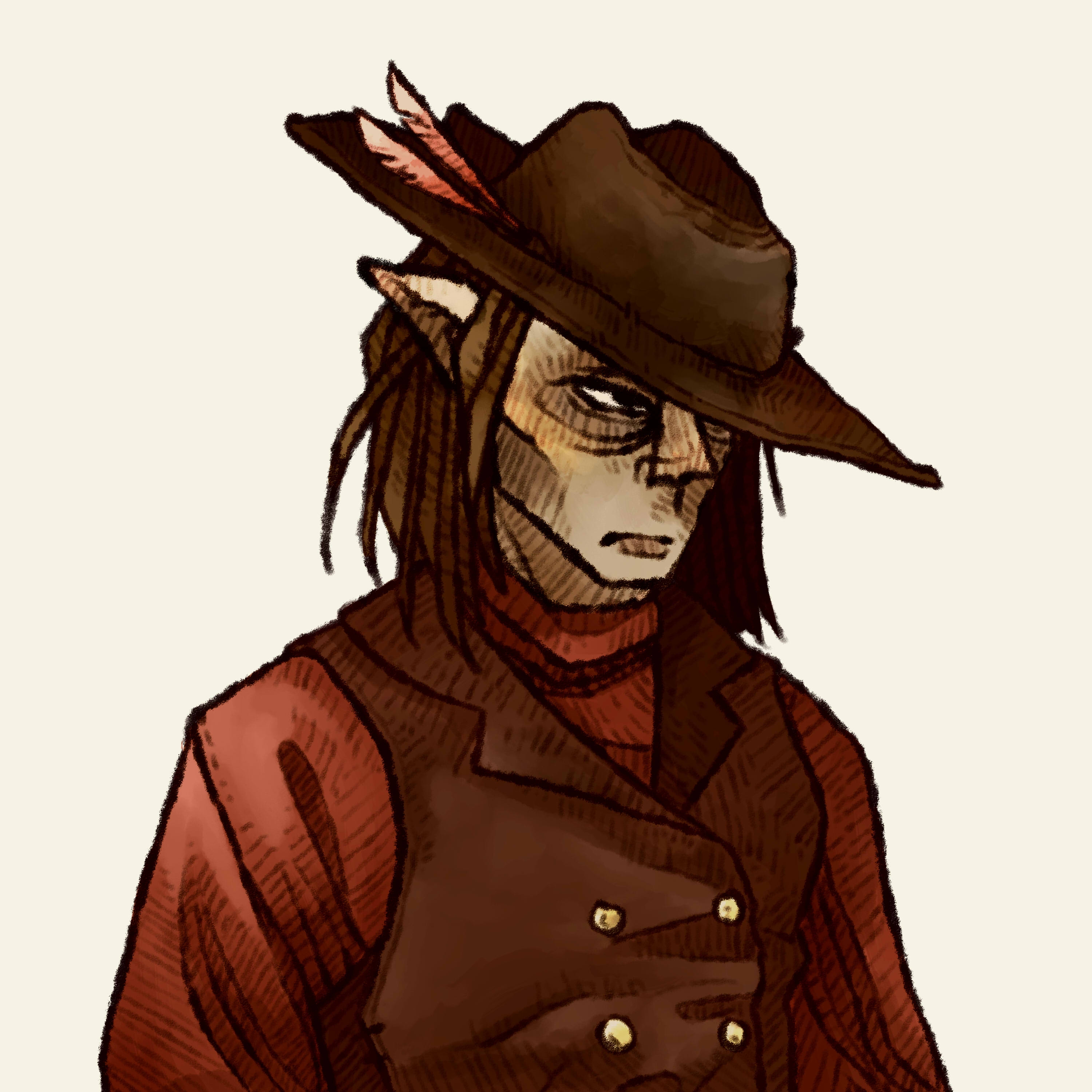 Marv 'Dual' Dulio. The first major NPC my party met. An old, weary, withering elf who's well past his prime. A big family man, with a soft spot for the younger generations. Despite his age, he still actively moves to aid against corruptions circulating what he now calls home- Hellsprings. A large sniper sits on display behind his counter at The Spitfire Saloon, yet despite how long he's been there, the gun never seems to collect dust... He looks like a sad, sopping Matt Mercer.