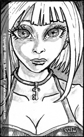 While most other civilian androids look like pure stock humans, this variety features proportions, mannerisms and speech styles based on Japanese female anime characters. As far as new era scholars can guess, the word ‘Waifu’ supposedly stems from the Japanese word for wife among adherents of ancient anime culture. It is suspected that these were built for long ago otaku and weeaboo — western terms for fans of anime and manga. While new era people may not know why these always female androids were made to look like they do, or why they frequently act like little girls even though they are typically built like erotic escort concubine models, waifu androids are highly prized by the owners of brothels, saloons, and the private chambers of new era warlords. Hand drawn ink art by William McAusland from page 37, from The Mutant Epoch RPG Expansion Rules book: https://www.amazon.com/dp/0994923791 or https://www.outlandarts.com/expansionrules.htm