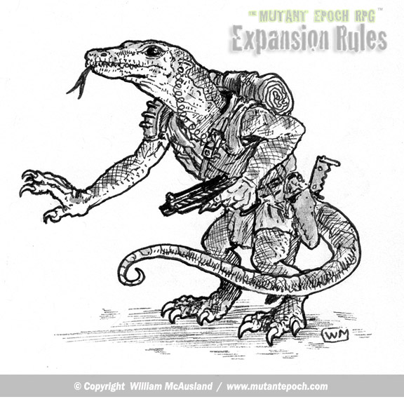 Hand drawn Ink art by William McAusland, writing by Corryn and W. McAusland These lizard bestial humans have a tough time getting admitted into a human settlement, and unless arriving with known humans, cyborgs or mutant humans, will be turned away at gunpoint. Even when admitted entry, often with a bribe of 30+3d6sp slipped to the guards, the monitor lizard must remain confined to the unit’s quarters and will not be allowed into any saloon, store or eatery. The reason for this animosity, which exceeds even that shown to bestial human gators, is because of the long-standing feud with reptilius and other lizard based humanoids. Common people, who have usually only heard frightening tales of the murderous raids by reptilius, cannot tell this character apart from the notorious — although much smaller — mutant lizard folk of the swamp. Hand drawn ink art from The Mutant Epoch RPG Expansion Rules book Check it out here: https://www.outlandarts.com/expansionrules.htm #monitorlizard #lizard #reptile #lizardman #beast #bestial #manimal #RPG #ttrpg #bestialhuman #characters #noaiart #williammcausland #wasteland #mutantepoch #apocalyptic #expansionrules #postapocalyptic #themutantepoch #outlandsystem #outlandarts #mutants #mutant #epoch #inkartist #Kamloopsartist #apocalyptic #fallout like #gammaworld