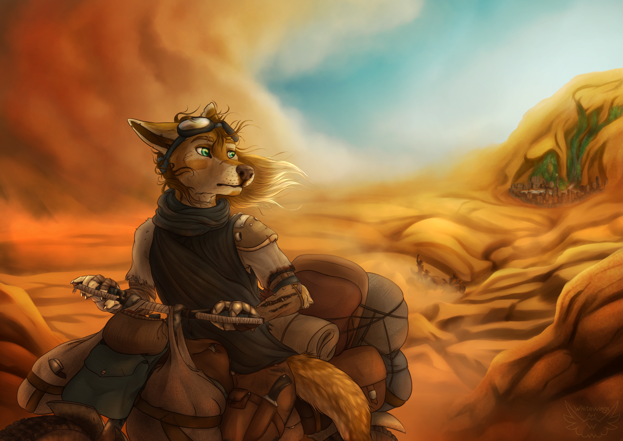 A vagabond dingo travels through the desertic wasteland, preparing to face a sandstorm after leaving a place they couldn't call "home". MadMax-inspired illustration, done a while ago for a local furry art gallery and as a future print. Comes with a [speedpaint](https://youtu.be/5YCOR8FTyF4) From 2019