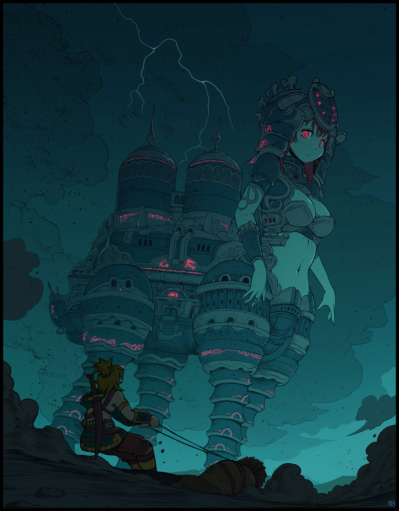 • Gliding at high speed on his shield thanks to the powerful traction of his sand seal, Link is approaching the immense giantess surrounded by a huge sand storm. he knows he will have to somehow get inside her to fix the situation. But How ? The picture started with a scene of sandstorm during the day but in the end, as I was tweaking the palette I really liked the nighty atmosphere here so I decided to go with it . It has a kind of serenity to it and really highlight the distance and just how big the giantess is i think :3