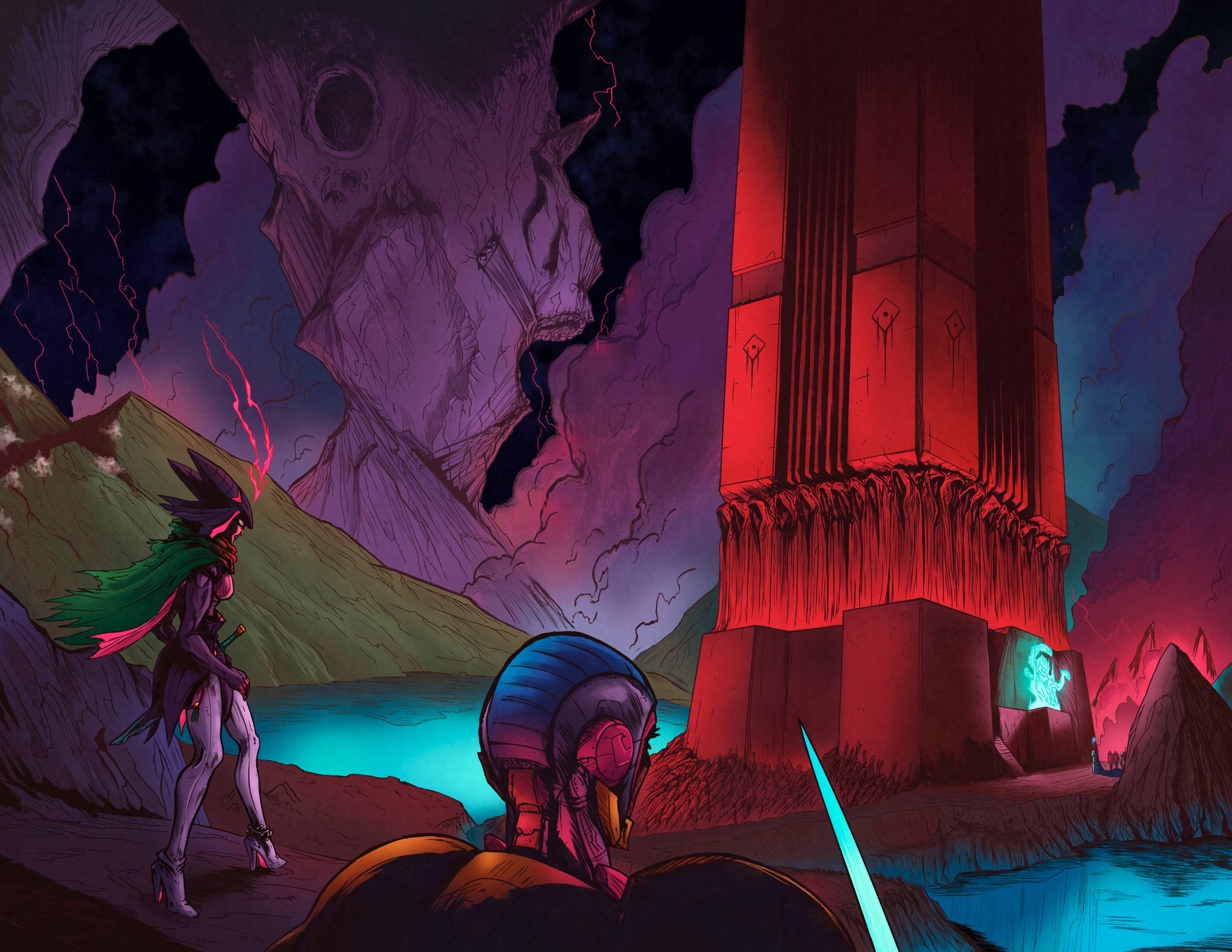 2-page spread from my 300 page comic, KWK. Scifi fantasy featuring witches, power armor and a fair few monsters.