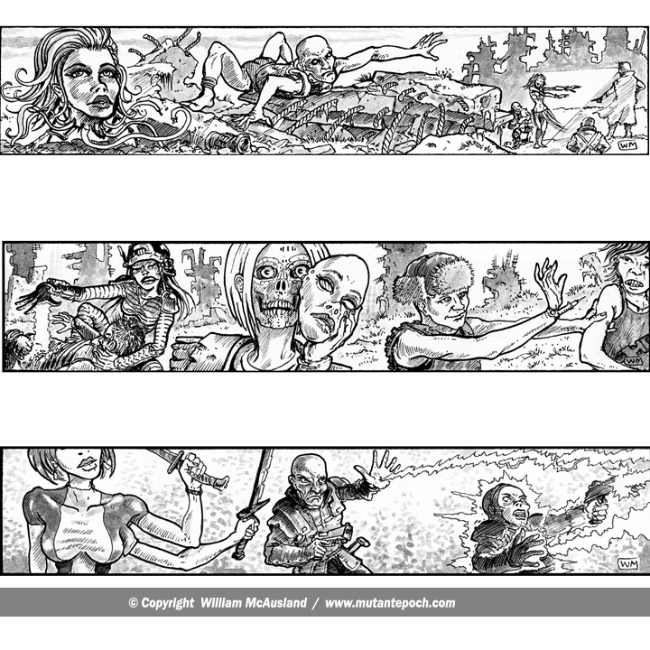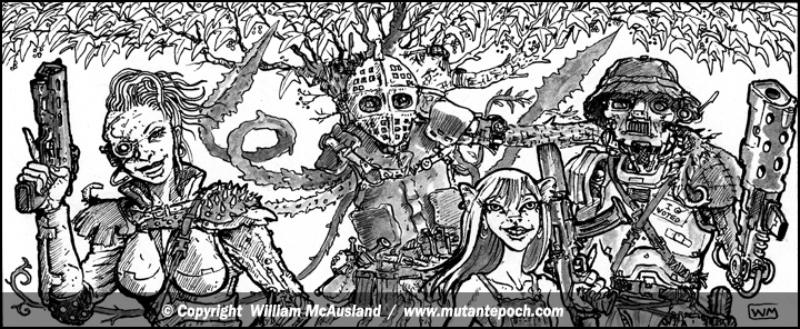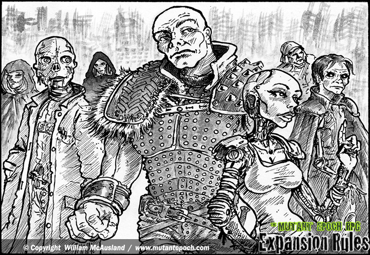 Ink art from page 52, 53 and 54 of The Mutant Epoch RPGs Expansion Rules Book.