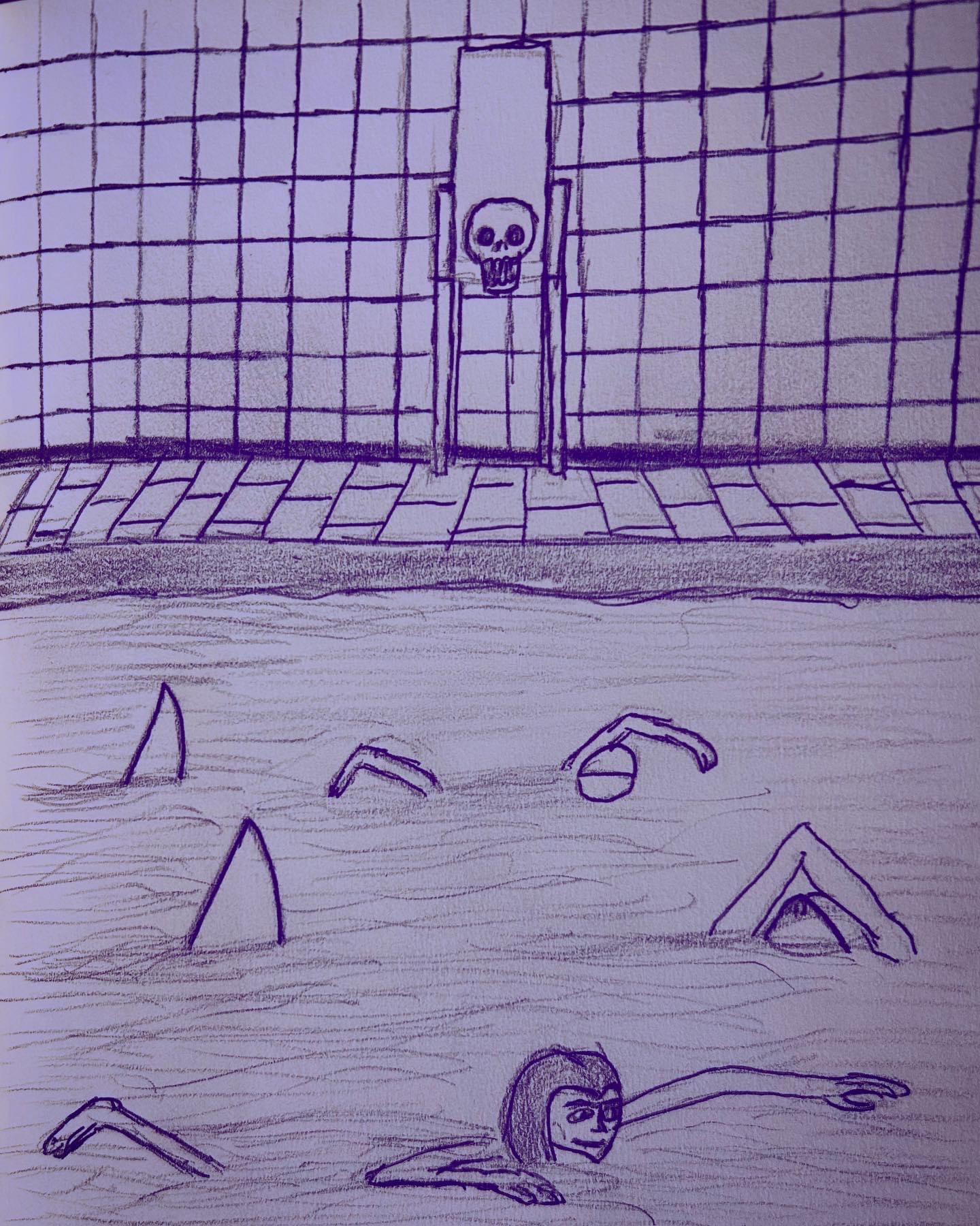 Swimming with Silas only guarantees somebody’s near-death experience. …well, any activity with Silas guarantees somebody’s near-death experience! But for any galeophobics, swimming in a shark-infested pool with Silas would be a downer. Originally drawn October 24 2023