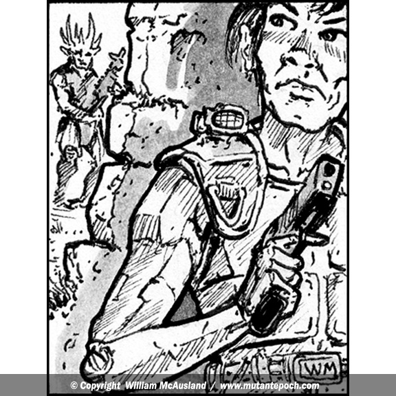 Ink illustration for page 46 of The Mutant Epoch RPGs Expansion Rules Book. See a huge art gallery from this book: https://www.outlandarts.com/TME-Expansion-Rules-ArtGallery1.htm