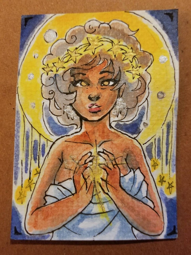 Artist trading card. Takes inspiration from Alphonse Mucha and the art nouveau movement. 2.5"x3.5". Ink, watercolor and some marker on paper. Art nouveau is one of my favorite styles. I wanted to see what darker skinned folks would look like in this style. So I did it. She's available here: https://www.etsy.com/listing/1321136070/atc-original-de-nuit-goddess-of-moon-and Etsy: http://etsy.com/shop/blackpixeldust