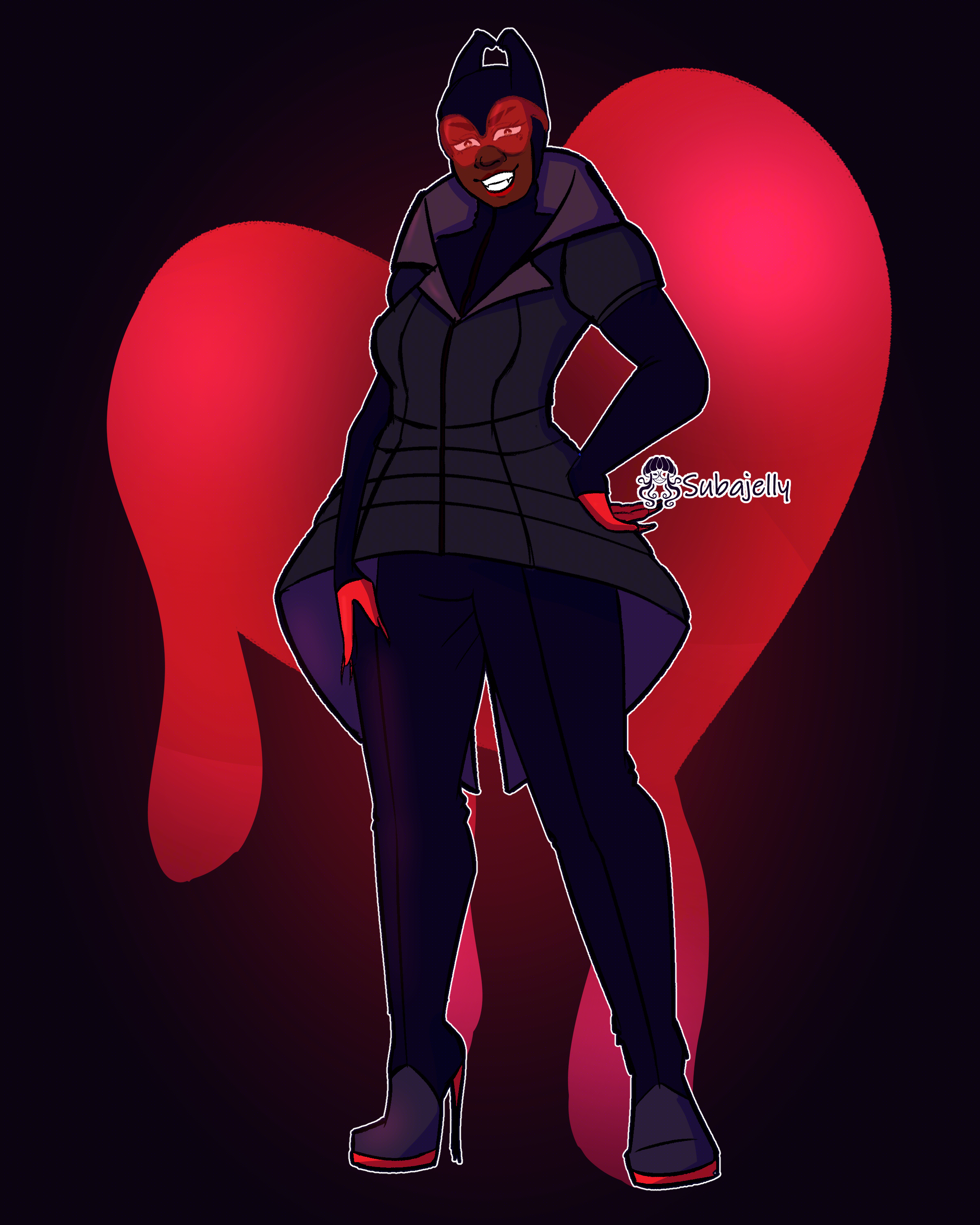 • Sketch fullbody of OC Nima. She's a plump darkskinned woman in stilletto heels and clawed gloves, smiling maniacly. She wears a cowl with antenna, a high-low coat with a segmented skirt, looking like wings in the back, and large goggles that look like fly eyes.