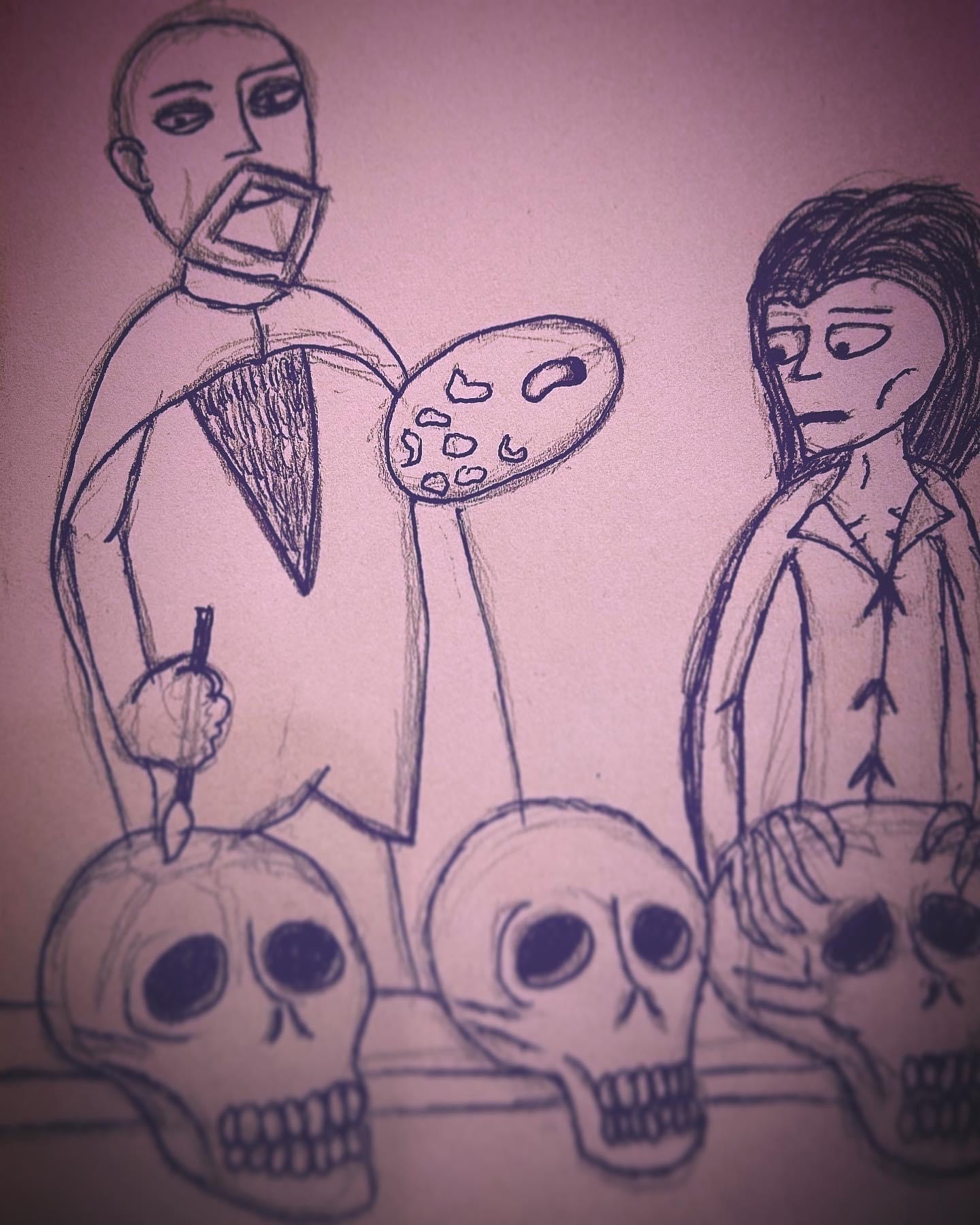 Silas watching Gustavo in awe of his skull-painting. Originally drawn October 14 2023