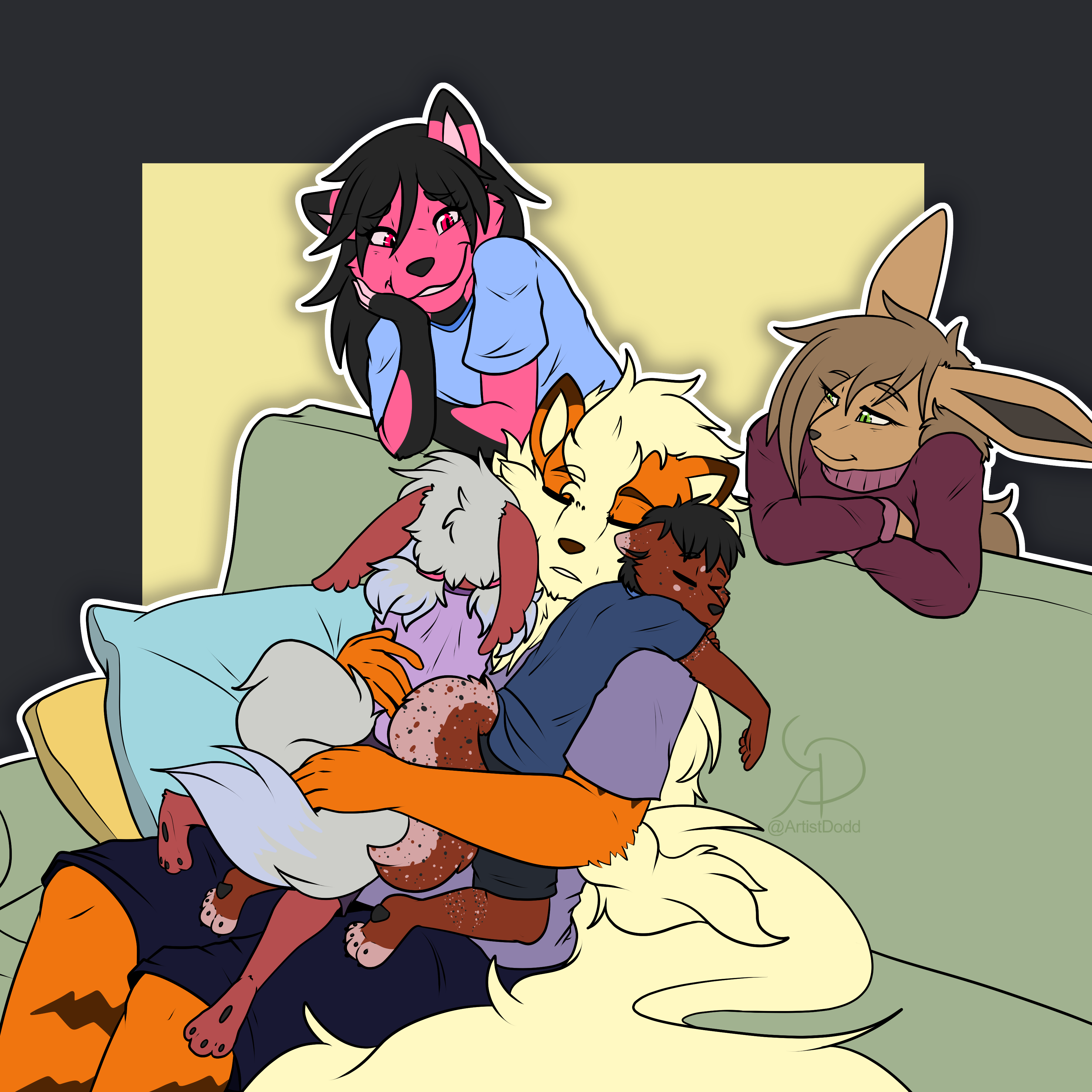 Rolf sure has got his arms full! Two kids! It's a good thing they all seem to be sleepy heads! Though he's never alone, as Alexis and Cora are there to help out too, but for now they're just going to enjoy the napping trio. Rolf belongs to [Guynio](Guynio) Rose and Milo belong to both [Guynio](Guynio) Alexis and Cora belong to me