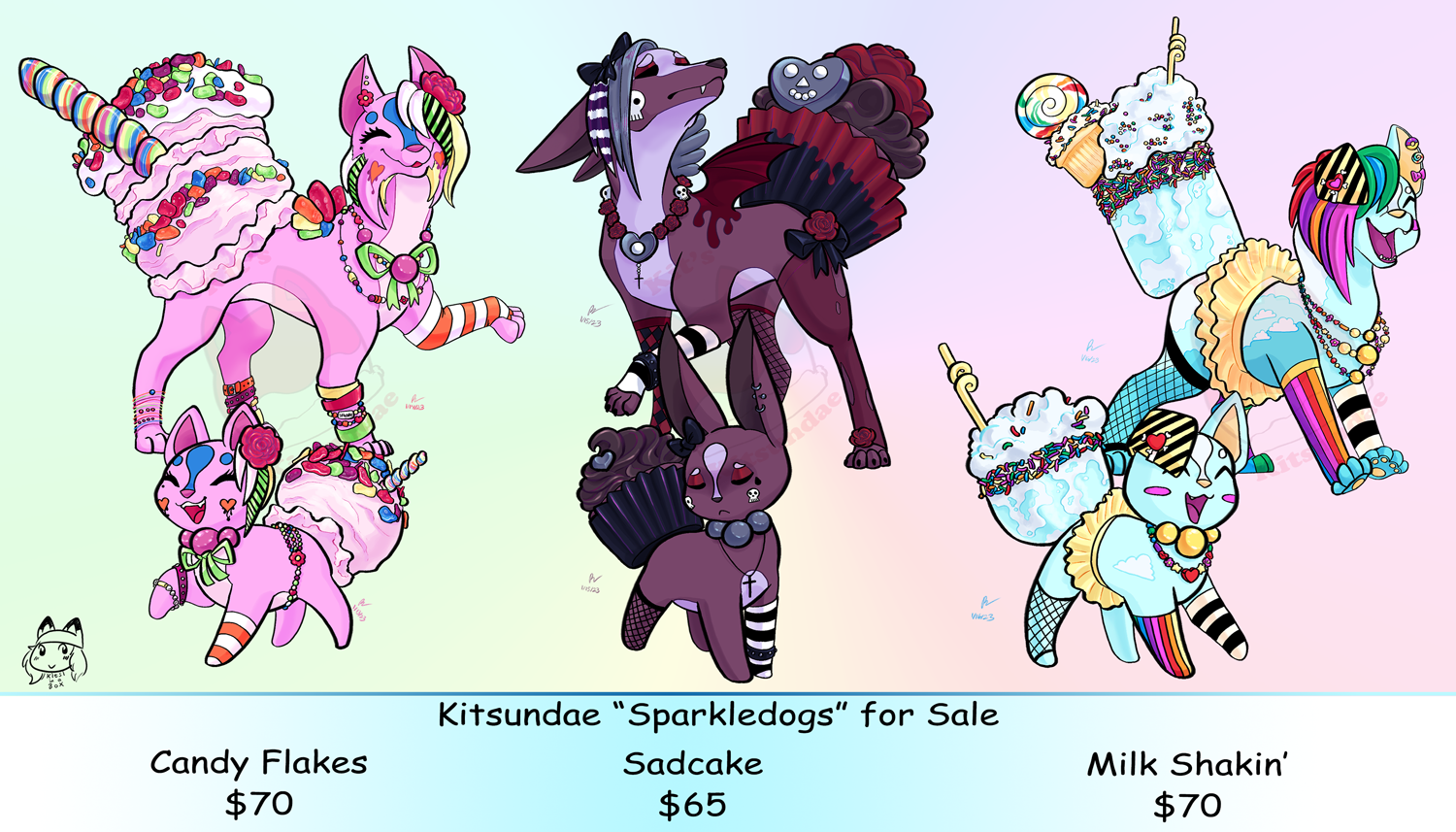 Got hit by inspiration for some Kitsundae, and their boosted forms! Seeing the resurrection of Sparkledogs, and how much fun they are, I wanted to dip my toes into that fun pond a bit. They're up for sale. If you buy them, you get a watermark-free .png of their default and boosted form I take payments via paypal or ko-fi Candy Flakes- $70 Sadcake- $65 Milk Shakin' - $70 Kitsundae are a closed adoptable species. If you'd like one for yourself, check their menu and send me a note! --> https://www.furaffinity.net/view/35070637/ We also have a discord for Kitsundae, if you'd like to come hang out and chat, send me a note and I'll give you an invite link.