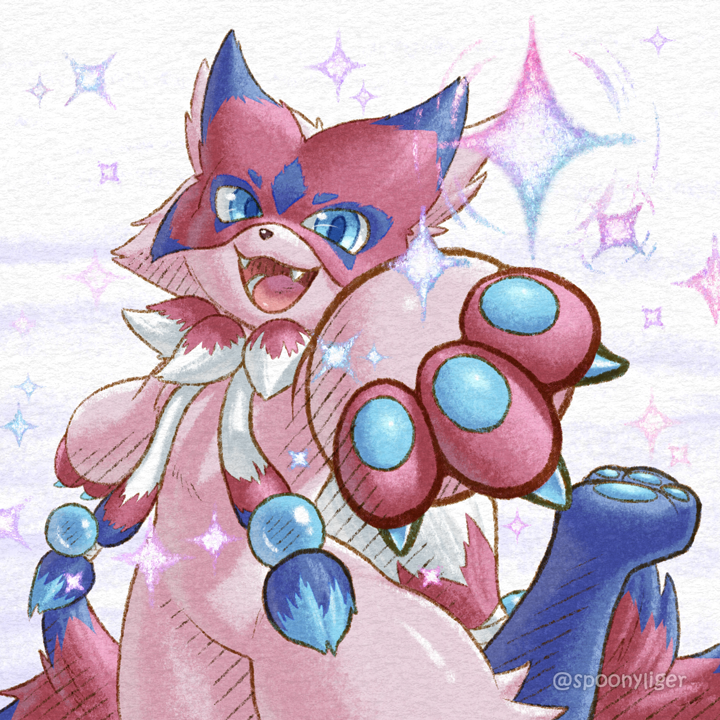 • A pink fox Pokemon OC with Meowscarada design elements, in an acrobatic pose extending its arm towards the viewer with colorful sparkles swirling around it.