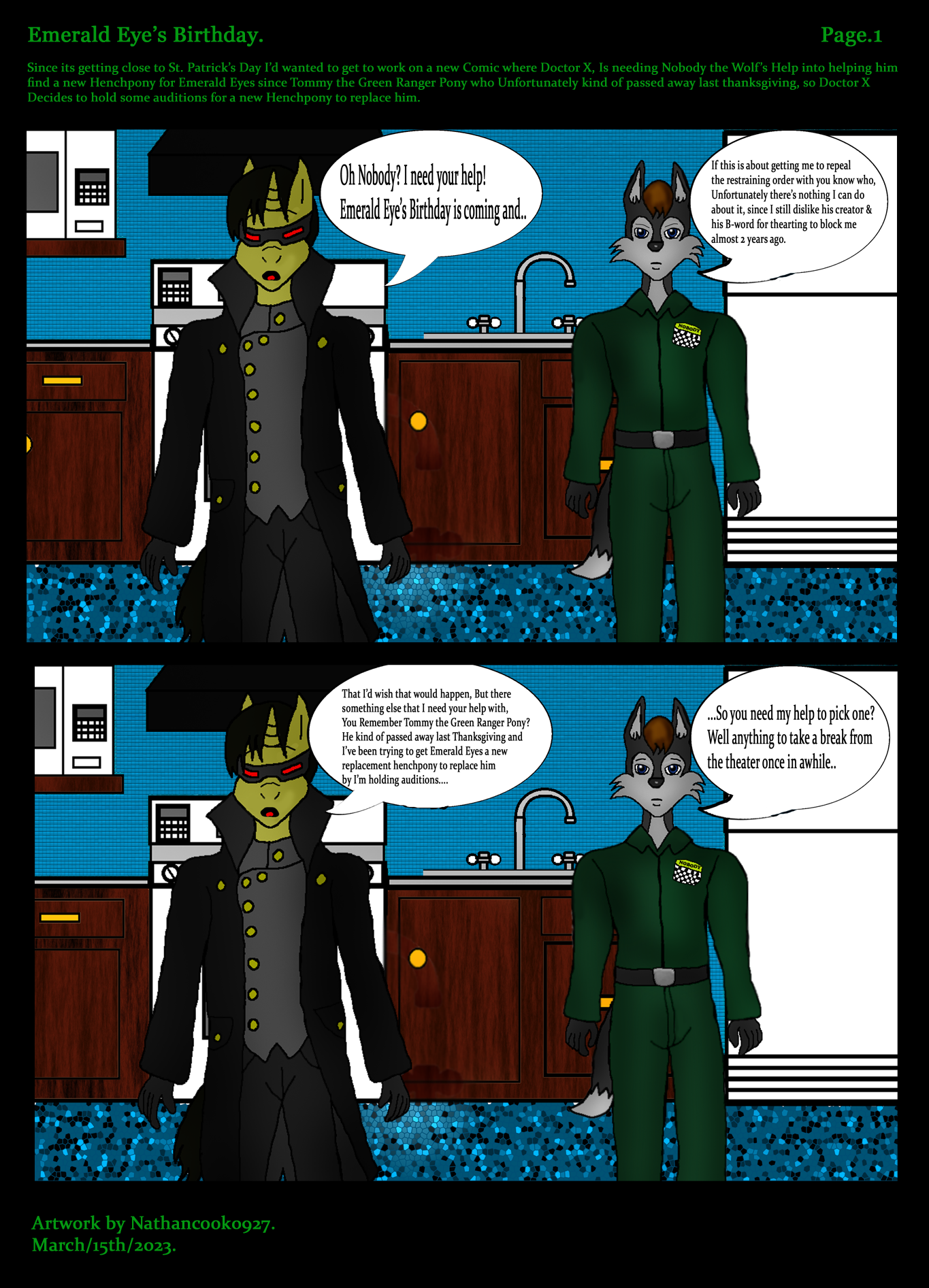 Since St. Patrick's Day is coming this Friday, I've decided to get to work on a Comic that I'd wanted to work on where Doctor X is trying to hire a new Henchpony to replace Tommy the Green Ranger Pony who had recently passed away around Thanksgiving ( Since the Actor who play Tommy the Green Power Ranger Passed away, so Doctor X is holding some auditions for a new Henchpony for Emerald Eyes and he ask Nobody for his help into picking the right Henchpony for the job. MLP Belongs to Hasbro. Doctor X, & Nobody the Wolf Belongs to Me Nathancook0927.