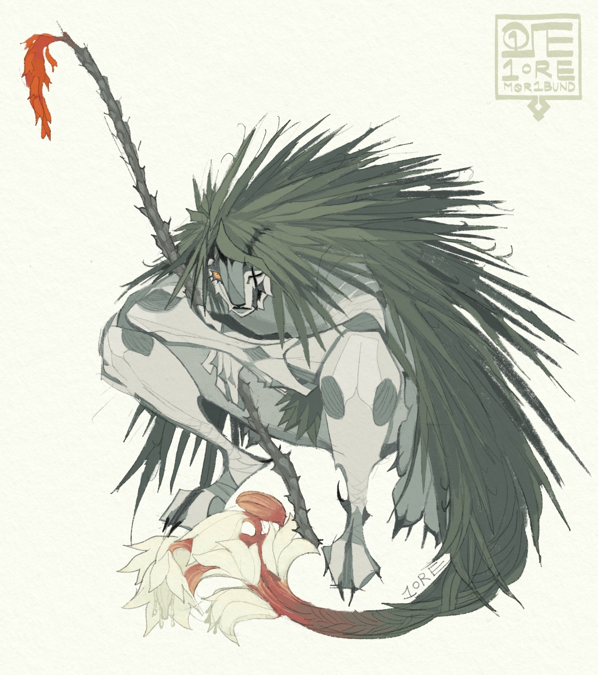 > [**Image:** The Lastborn, a Sylvari of Guild Wars 2 infamy. He’s tall and svelte, with an enormous mane of yucca that terminates with loose braids. They weave around a flowering stalk, which sits at his feet like a ponytail. He has a skirt of agave that looks a bit like a tailcoat, as well. The features of his face are trim and sharp, with a tall, broad nose that’s almost kitty-like, and a pointed gaze that’s lidded by pointier eyelashes. Most striking is the wound over his right eye, which runs all the way from his jaw to his scalp. It exposes much of the darker tissue under his cheek. > > He sits on the ground with his arms on his knees, clutching a makeshift ocotillo walking stick and brooding.] ◆◆◆ "No, you're right. I lied to you. I was not birthed, but expelled, like a malignant tumor being cut out of a body. The Tree deposited me here with her furthest root. I crawled out of the dirt and into the desert, alone. When the Court finally found me, they said that they had created me, that they had finally inoculated the Tree with their nightmares. But I believe they were merely taking credit for what was a natural immune response—that is, ridding her body of trauma— in order to groom me. Nonetheless I carry it inside of me. I am called every day by morbid visions that are mine, but which do not belong to me. The Court wants to use me to sow anguish and heartbreak among their kin, and the Wardens want me dead. Some believe this is why I was really created, so that this immortal and intangible evil could be made into something mortal and tangible… Something that could be killed. But you are already familiar with such things, no, dragonslayer? Why are you really here? Did the Pact send you? The Wardens? The Tree herself? Because I cannot imagine why someone like you would come to meet someone like me, except to do their dirty work." ◆◆◆ The Lastborn is a sylvari(?) pariah who mostly keeps to himself and fucks around in the desert. He is dry (pun intended) and emotionally austere, but insightful. People typically get a selfish, callous vibe over a thoughtful vibe, though, because of his rigid commitment to isolation and nonintervention. In truth, he feels he must “go it alone” to protect himself and those around him. Everyone knows that something went wrong during his creation… or maybe something went wrong long before his creation, and he was just collateral. Either way, the Lastborn emerged from the Pale Tree less like a daughter sprout and more like a root parasite. The Dream that he was fed is completely unrecognizable to most of his peers, a fever dream of fear and pain. The Court considers him to be the first son raised from their Nightmare, and whether or not this is actually true, this narrative has been compelling enough to estrange him from the Tree and her children. His apparent abandonment—coupled with his induction into the Court during his formative years—is the ultimate condemnation in the minds of his peers. Worse still, he feels his Wyld Hunt calling him to return to these morbid memories, the way you might pick and scratch at a wound that won’t heal. The possibility that he’ll be called to do something terrible has frightened him into living in isolation—or at least, that’s what he tells those who have the grace to ask first, instead of attacking him on sight. Really, he’s a hermit by choice as much as he is by circumstances outside of his control. He’s not as desperate for belonging as he used to be, and it’s been years since he made his quiet exit from the Court… Though he’ll probably never be out of the shadow of (indicates generally) whatever that was. Other schtuff: * Not in touch with the Dream, but constantly receives Visions And Nightmares against his will. You could probably consider him an oracle, but only for worst case scenarios, intrusive thoughts, and terrible ideas. And he can’t even tell you if they’re actually going to happen or not. * Not outwardly hung up about being estranged from the Pale Tree and her kids, but maybe a little bit on the inside. Un poquito. I think the two of them reach an understanding later that she did All That to try and protect him (for better or worse.) * Unsure if he emerged with a name or not. If he did, he has never spoken it to others. “The Lastborn” (sometimes “Lostborn”) is an epithet bestowed on him in lieu of a true name. Later on he learns from his friends that you can give yourself a name, or ask other people to name you, and you can change it as many times as you want, and he goes appropriately ham. * Ofc not actually lastborn (others come after him, albeit in a more normal way.) but my lot in life is that every couple of years I recreate [the last firstborn](https://celldweller.bandcamp.com/track/the-last-firstborn) * ⠀ * I just think it’s funny if the Court did all these awful things in order to make an eeeevil treebaby. But in the end you fucked up a perfectly good sylvari is what you did. Look at him. He has anxiety.