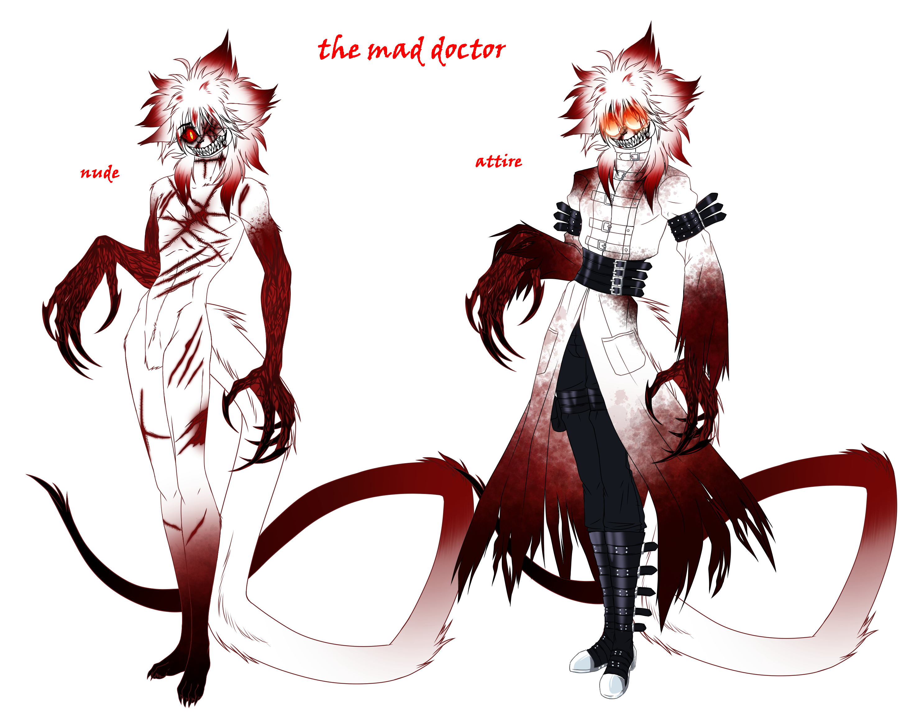 I made his fur completely white cuz I imagine him looking more like a false albino or leucistic. he's very much inspired by films such as "the void" and the "re-animator " [Name] - Dr.Drachen [Age] - unknown [Gender] - male [Species] - mobian/demon [Personality] - evil, psychopathic, down right insane, creepy, is extremely intelligent, menacing, cunning, deceitful, untrustworthy, disturbing in every way, dark sense of humor, prideful of his work. [Power] - summon objects such as surgeon tools and certain demonic creatures - transform his hands into a saw or some sort of blade -he is able to fix people from any deadly wounds that are beyond repair, even reanimate people back from the dead, create cures and treatments for any condition, illness, disease or viruses known and unknown to man but will only give these services to a person through a deal . - immortal to an extent - mess with people minds and change the environment around them when entering his labyrinth of hospital - heal a bit quicker and can take pain - able to cross dimensions and the living world using the doors in the hospital . - see in the dark and has great sense of hearing - is fast as hell - sense other supernatural beings [Friends] - good loyal friends with dokeshi [Love interest] - death belonging toda-launtic5150 [Sexuality] - demi romantic, asexual [Other facts] - disappeared somewhere in the 1970's - was a medical doctor / scientist researcher - he suffers from schizophrenia , before he became this monster he had already had this condition as a mortal man but he was able manage his symptoms and function normally even earning himself a high class job but after the event in which he was stuck in hell he was unable to fully manage his condition anymore and it became worse and worse following his downfall to insanity and madness. - has seven demons created by his own hand showing parallels to the seven deadly sins and who he treats as his children for they share fragments of his own brain tissue. ------------------------------------------------------------ sadly i can not write the rest of his story do to word limit on this things which fucking sucks!!! but in short he's a half demon like being who mutilates and performs surgeries on his victims which he calls his patients in a hospital that tends to cross over the living world . people think its and abandoned hospital so they enter and the entrance disappears on them leaving them trapped in this maze of hallways and hospital rooms with the doctor and his creations chase them down in. those who under go his surgery and die are said to be the lucky ones while those that survive the ordeal live in constant agony in an unrecognizable body to serv the doc.