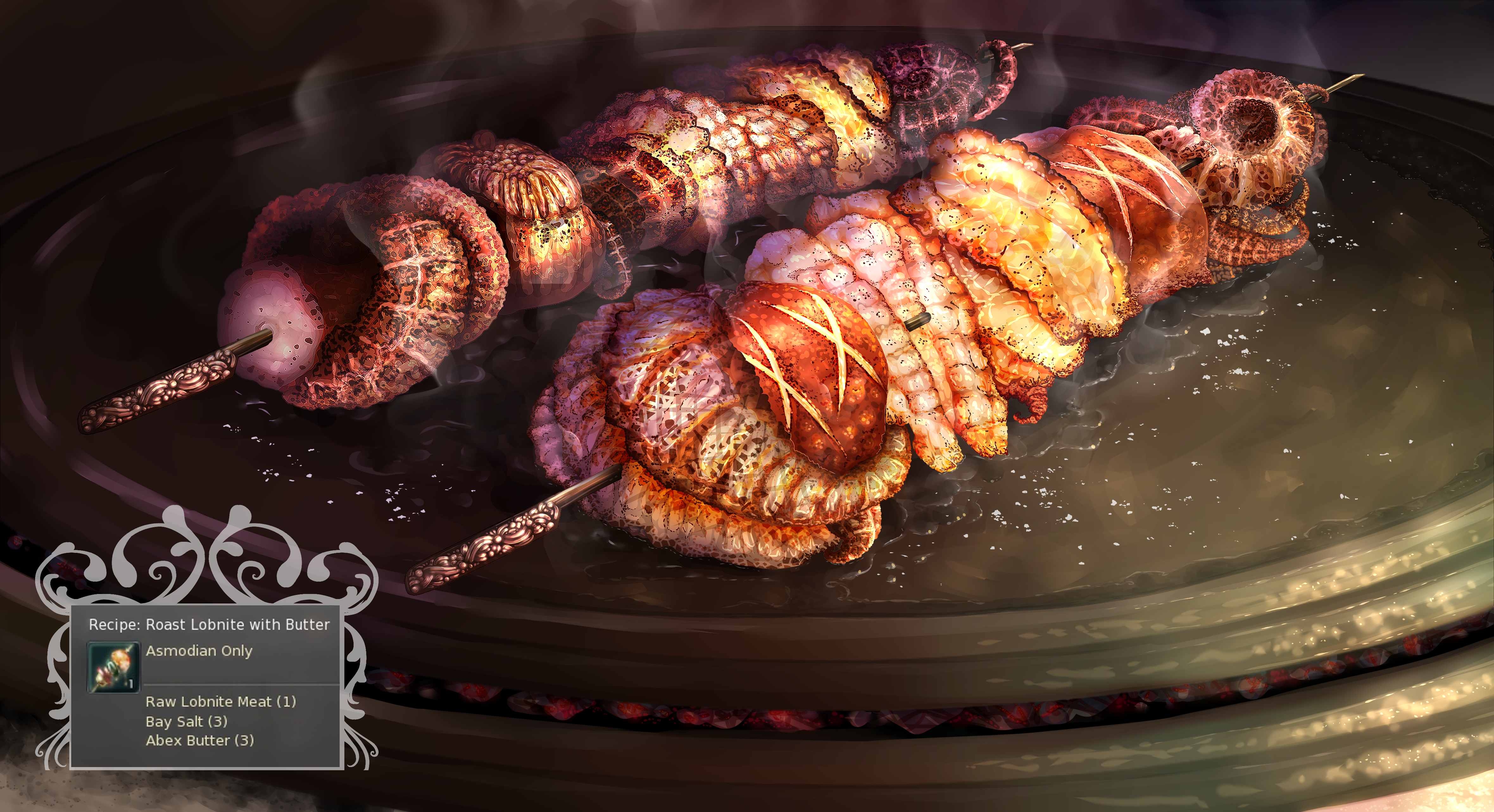 Published: Jan 11, 2024 / MMORPG Aion published by NCsoft ------ 🙥 Roast Lobnite with Butter 🙧 Crustacean or Mollusc? Lobnites seem to occupy both classifications of the invertebrate tree of life. Found on both sides of Atreia, they are a really ancient species too, dating back to the great oceans. Fossils of those can still be found in the sediments. Two of their still alive kin are found in Asmodae: The Tentacled Lobnite of Altgard and Frost Lobnite in Beluslan.Both living at or on icy waters. Their different life stages fill different niches. Their offspring grazing particles under ice sheets, using their crab like legs and grasping claws to pick them up, right into their beaked moths, surrounded by rings of tentacles. Pre and young adults will traverse the waters.Using their syphon to propel them or change direction, while the gas in their chambered shells make them adjust high and depths. With the help of their tentacles, they will smell out fish and crustaceans, as well as dead material. Full grown and hip high Individuals, give up their fully aquatic lifestyle and become semi aquatic. Still living and feeding near the water or on the ice sheets.Here they have opportunistic and omnivorous feeding behavior, grabbing whatever they can pick apart with their frontal grabbing claws. Their movement is dependent on their crab-like legs, dragging their big planispiral shell behind them. And while always keeping a big watchful eye on their surroundings, they are not aggressive. Though they can become quite intrusive, if hungry and if a feeding source is denied. Then they might start picking on humans, pinching them. Which is everything but pleasant, considering their size, but what's even more unpleasant, is this cephalopod's ability to sting, if they feel threatened. Their secondary tentacles have flexible, razor-sharp quills made of keratin shooting out their soft husks. Designed to impale and thick as a finger, the nettled toxins of the tentacles getting rubbed into the open wounds are the smallest problem of those attacked by an angry Lobnite. Once slain, they make for a pretty good feast. All the harvested meat can be skewed. Primary big tentacles, thick as a child's arm, can be attached whole, while secondary ones have to be dequilled first.The inner tissue with the finer tentacles around their chitin beak can be turned inside out, while other tissues can be filled up with the more fragile parts of the animal, making for little hot pockets. Legs and claws can be cracked, to reveal their flesh. Put together on a big, metal skewer, they will be fast roasted over a fire, before their delicate flesh is placed on a heat plate, to let chocals finish the work. In the meantime, three blocks of Abex butter shall be used to cover the browning surface. Rotate to dispose evenly and finish off with the same amount of bay salt, as the meat is very mild, due to its freshwater lifestyle. If prepaid right, the meat varies from flaky to chewy - not gummy - depending on which body part is consumed. Its taste also variegate from cab, fishy, to a mildly sweet and nutty flavor. Enjoy, as one does not eat such a big ancient creature every other day! ------ Drawn with Paint Tool Sai / Wacom Intuos pro M PTH 651 ------