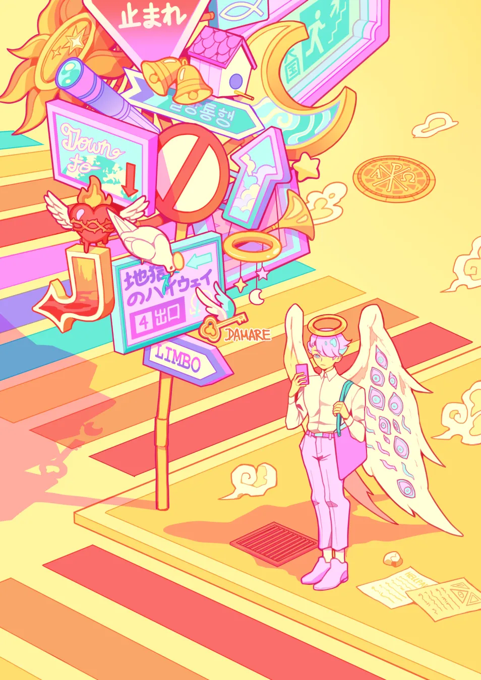 • This was hella fun to work on. Yellow is one of my favorite colors but I rarely use it. It is pretty hard to combine with the vaporwave aesthetic. What do you think? And what is your favorite thing in the picture? Mine are the flying key and the angel :3