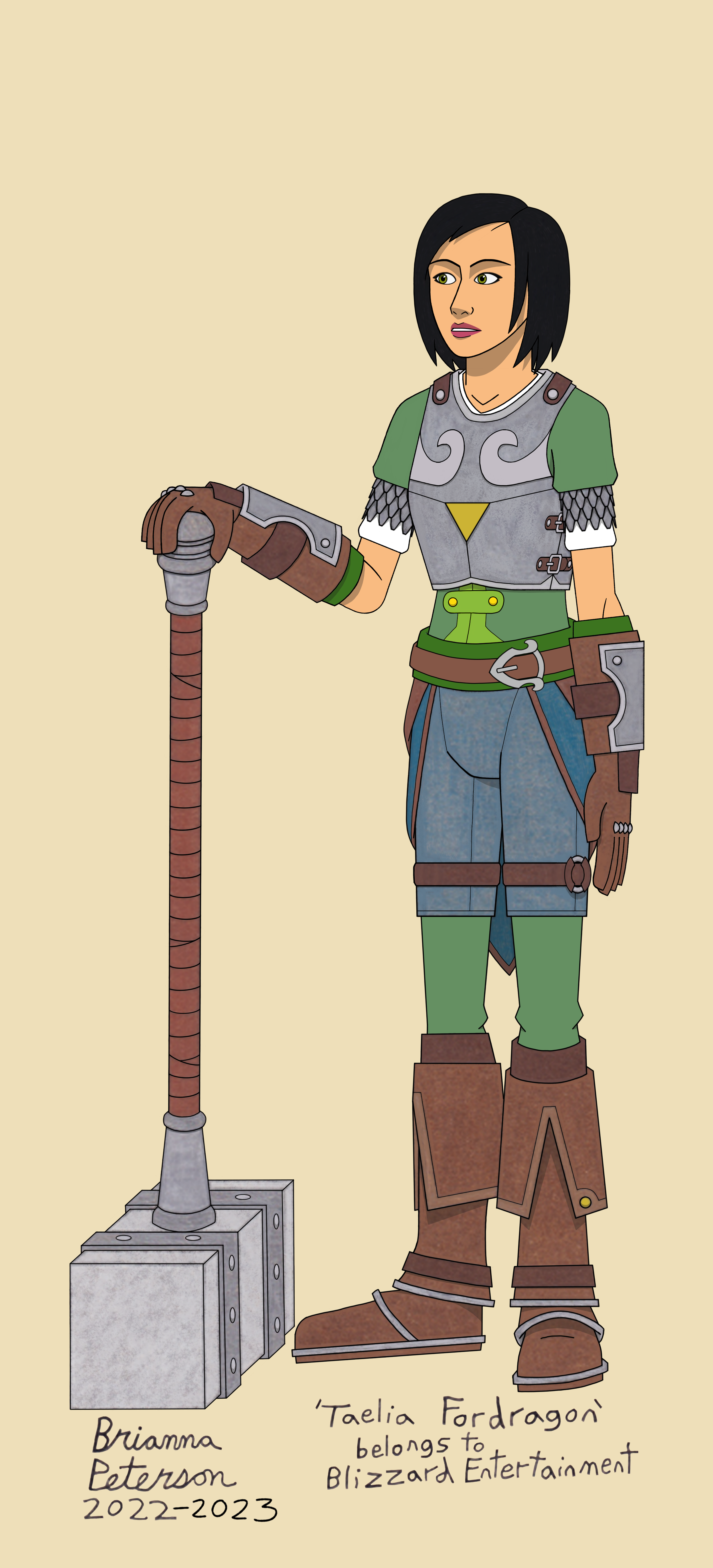 Fan-art of Taelia Fordragon, daughter of Bolvar Fordragon, and really great with a two-handed hammer. I'm on Team Taeduin--shipping Taelia with Anduin, because I think they might be good for each other; Anduin might show her how gentleness and understanding go a long way in pursuing good/noble causes, and Taelia might show him a thing or two about assertiveness and keeping himself grounded. Done with mechanical pencil, colored pencil with blending stick, gel pens, and then Sketchbook Pro. 'Taelia Fordragon' and the 'World Of Warcraft' videogame she comes from are copyright of Blizzard Entertainment (Activision-Blizzard)