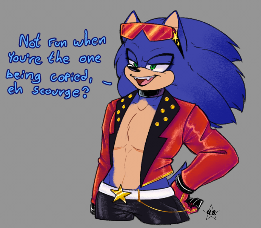 • I saw that 'rockstar' outfit for Sonic and knew what had to be done. You can't see it but Scourge is seething off screen. (I wanted to draw that too, but my pizza is ready and I'm STARVING :U )