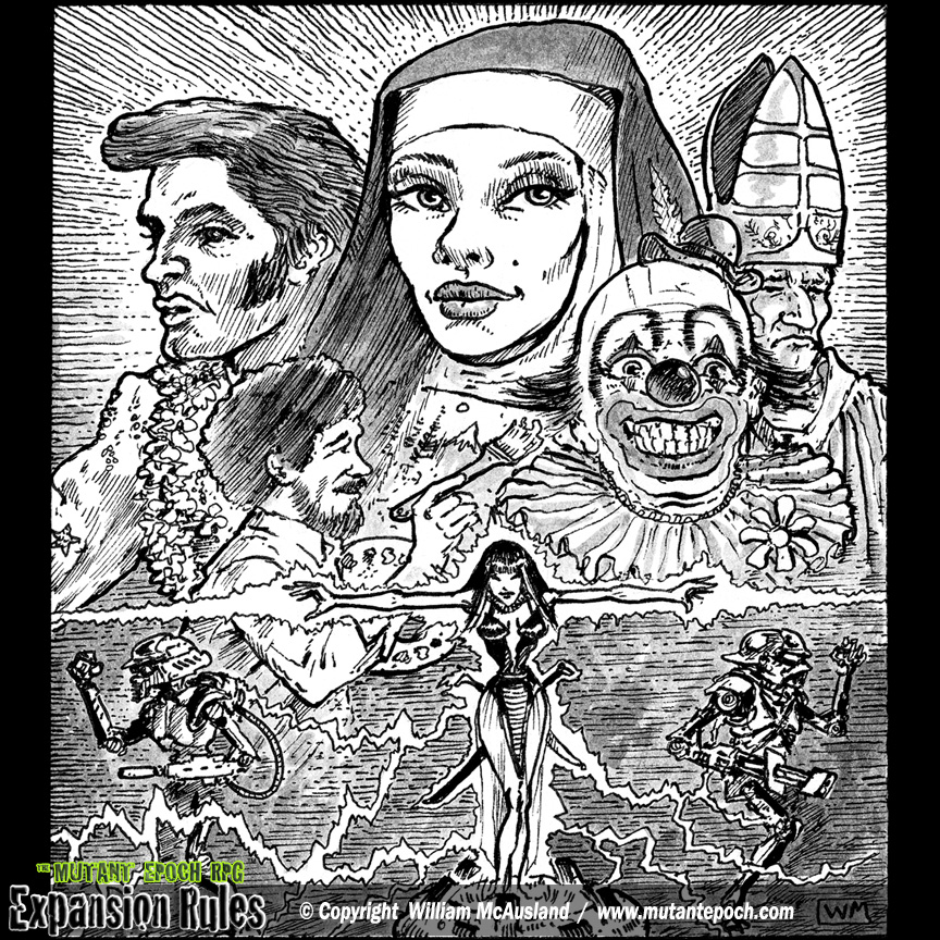 elvis, nun, pope, clown, bob ross, happy little clouds, digital being, AI entity, self aware, agent, combot, robot, warbot, montage, characters, mutant epoch, apocalyptic, expansion rules, post-apocalyptic, the mutant epoch, outland system, RPG, ttrpg, outland arts, mutants, mutant, epoch, wasteland weekend, ink artist, game art, rpg art, TME, william mcausland, like, gamma world, or, mutant year zero, mutant crawl classics,