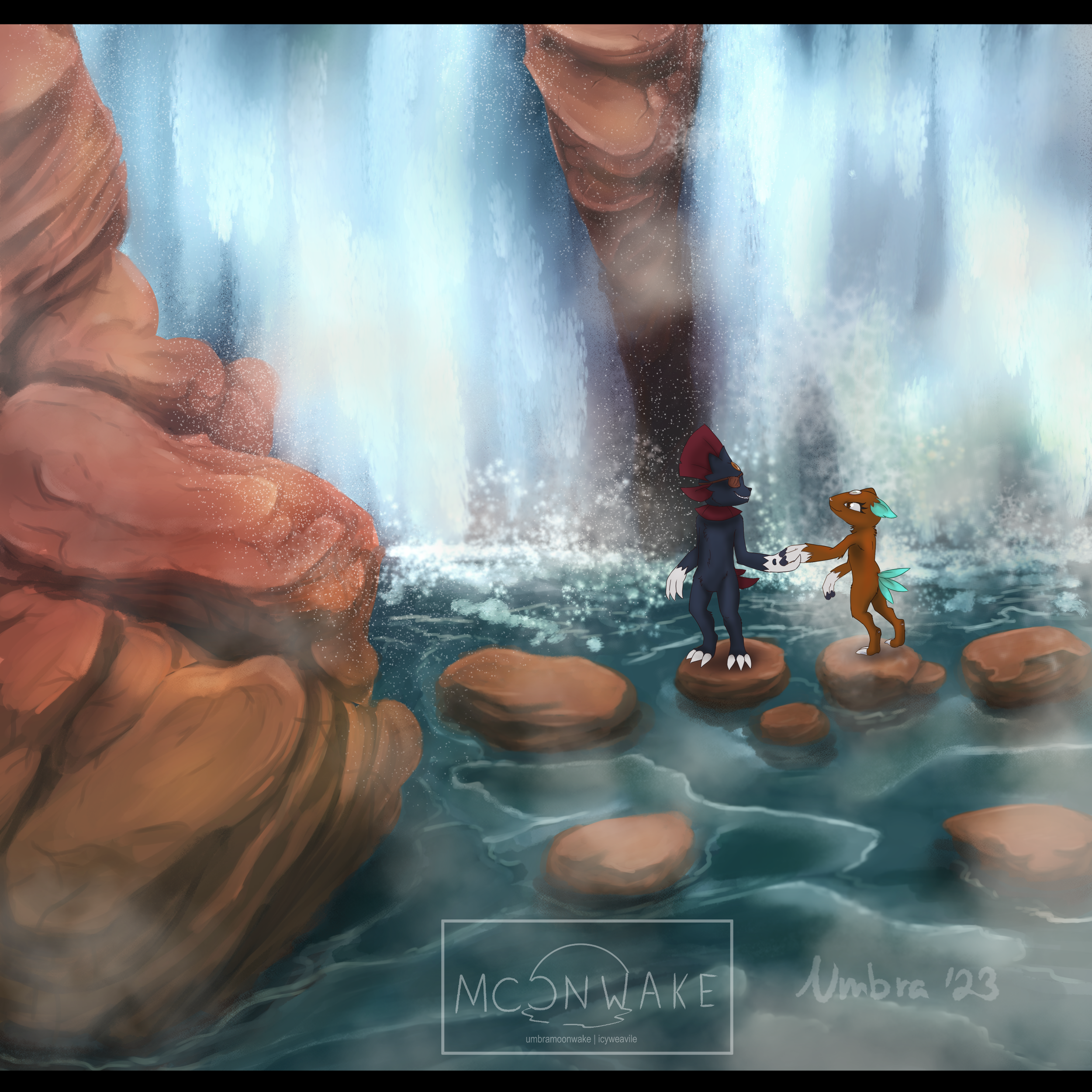 • Two of my characters enjoying time together by some EXTREMELY LOUD WATERFALLS.