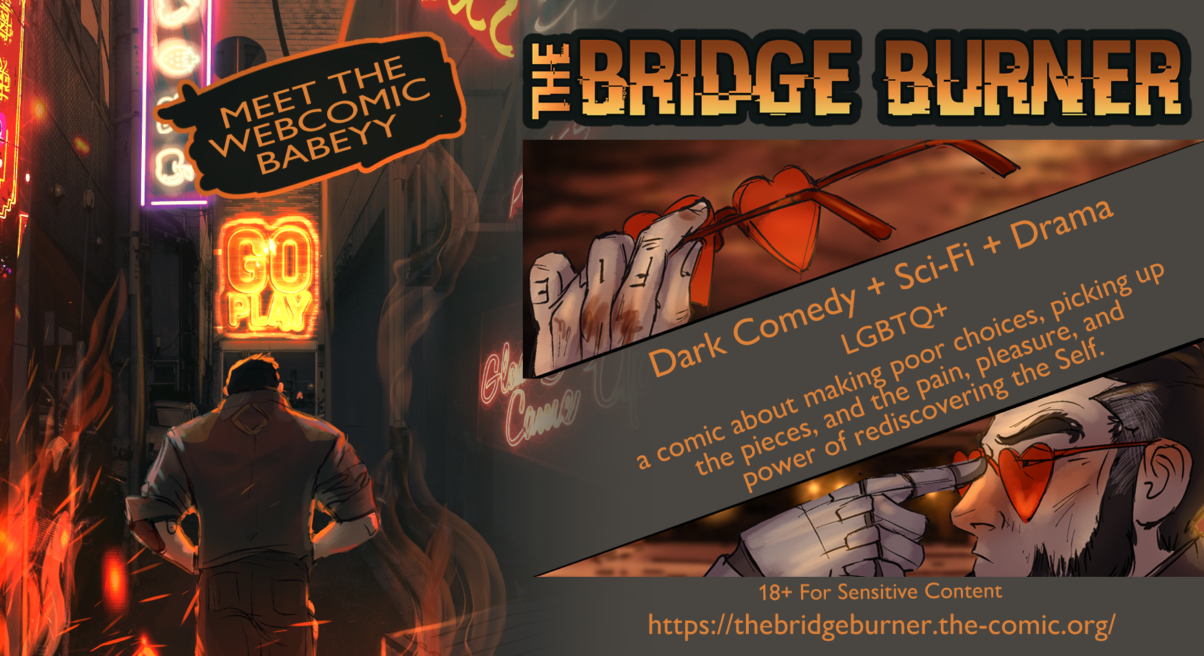 it's #webcomicday and I am a webcomic creator! The Bridge Burner is about an aging queer punk just trying to live in a near-future Corporatocracy. In learning how to grieve and cope with his mistakes, Ross finds himself and rises from the ashes of the bridges he burned. It is very much rated M for adult content and sensitive content. Please consider the trigger warnings before proceeding, as this is written through a lens of my personal experience, and serves the primary purpose of helping me process my own traumas. https://thebridgeburner.the-comic.org/archive/