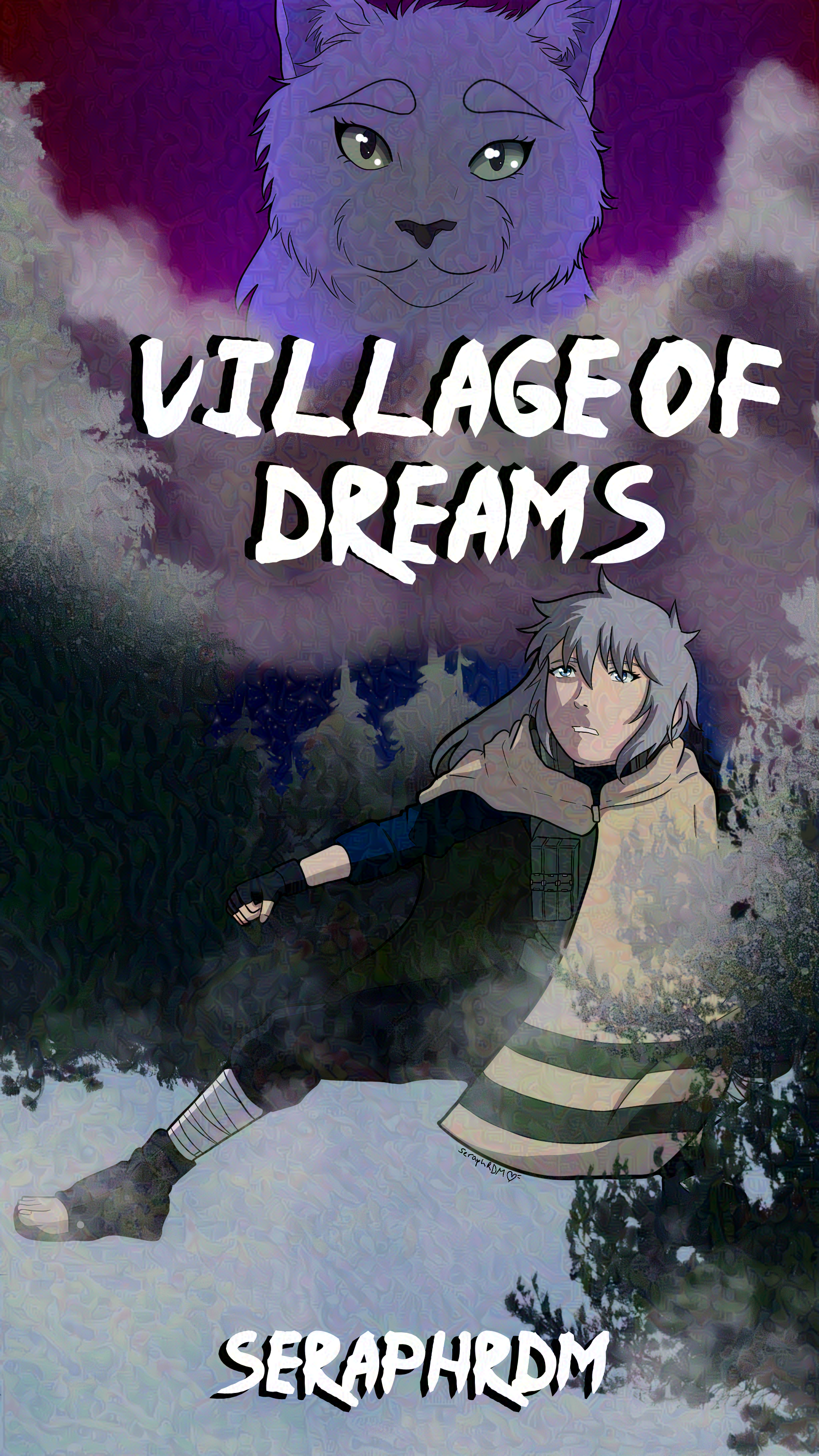 Alt Text: A digital art pice featuring the main character, Tsukiya, wearing a winter cloak. She is gazing up in awe. Above her is a visage of a cat beast with a surprisingly gentle expression. She is surrounded by a purple aura/chakra. Separating the two is a set of clouds.Cover to my Naruto fanfiction, "Village of Dreams" which is on Archive of our Own. I could tell you about the story but honestly I would end up spoiling it and it's better to just sit back and read the chaos that I'm writing. https://archiveofourown.org/works/43888413/chapters/110350230 Alt Text: A digital art pice featuring the main character, Tsukiya, wearing a winter cloak. She is gazing up in awe. Above her is a visage of a cat beast with a surprisingly gentle expression. She is surrounded by a purple aura/chakra. Separating the two is a set of clouds.0 Comments 0 Shares 3 Views -