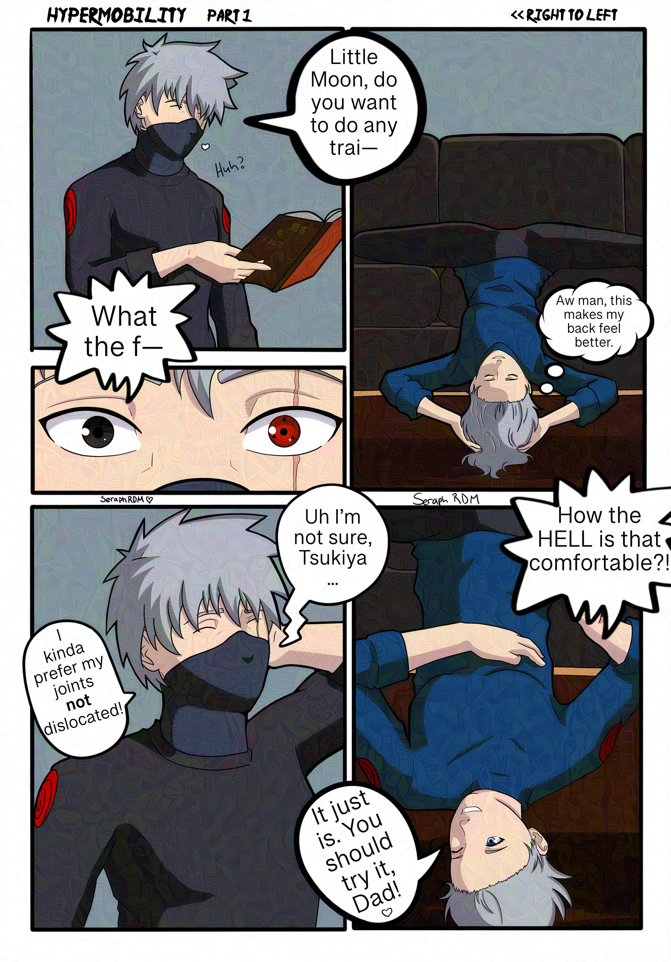 Panel 5: Kakashi scratches the back of his head and says, "Uh, I'm not sure, Tsukiya. I kinda prefer my joints not dislocated."Part 1 of a mini manga about Tsukiya's hypermobility. Poor Kakashi doesn't quite understand his child's joints are actually Not Normal. Please do not try this at home if you are not hypermobile. Alt Text: Reading right to left: Panel 1: Tsukiya is upside down and hanging off the couch with their legs crossed but lying flat against the couch. They're thinking "Man, this makes my back feel better" Panel 2: Kakashi entering the room with a book in his hand and he goes to say, "Little Moon, do you want to do any trai—" Panel 3: Kakashi's eyes widen and he says "What the f—" Panel 4: Kakashi exclaims, "How the HELL is that comfortable?!" while Tsukiya rolls slightly to the side to look at him. They say, "It just is. You should try it, Dad!" Panel 5: Kakashi scratches the back of his head and says, "Uh, I'm not sure, Tsukiya. I kinda prefer my joints not dislocated."0 Comments 0 Shares 2 Views -