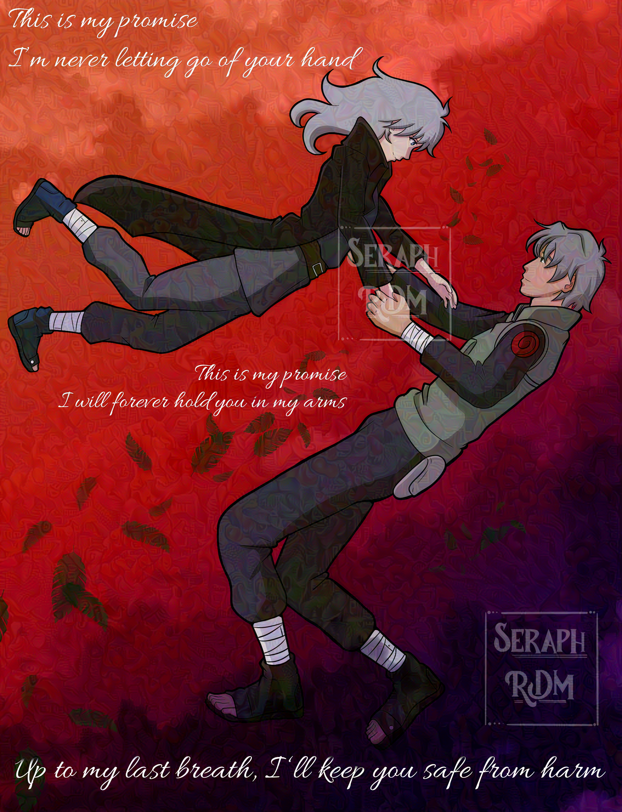 - SeraphInspired by the song "The Promise" by Stream of Passion, here are my Naruto OCs together being the gayest they possibly can be. /j /lh Alt Text: A drawing of Tsukiya and Hiiragi 'falling' through the clouds during sunset, with song lyrics. "This is my promise, I'm never letting go of your hand. This is my promise, I wil forever hold you in my arsm. Up to my last breath, I'll keep you safe from harm." - Seraph0 Comments 0 Shares 4 Views -