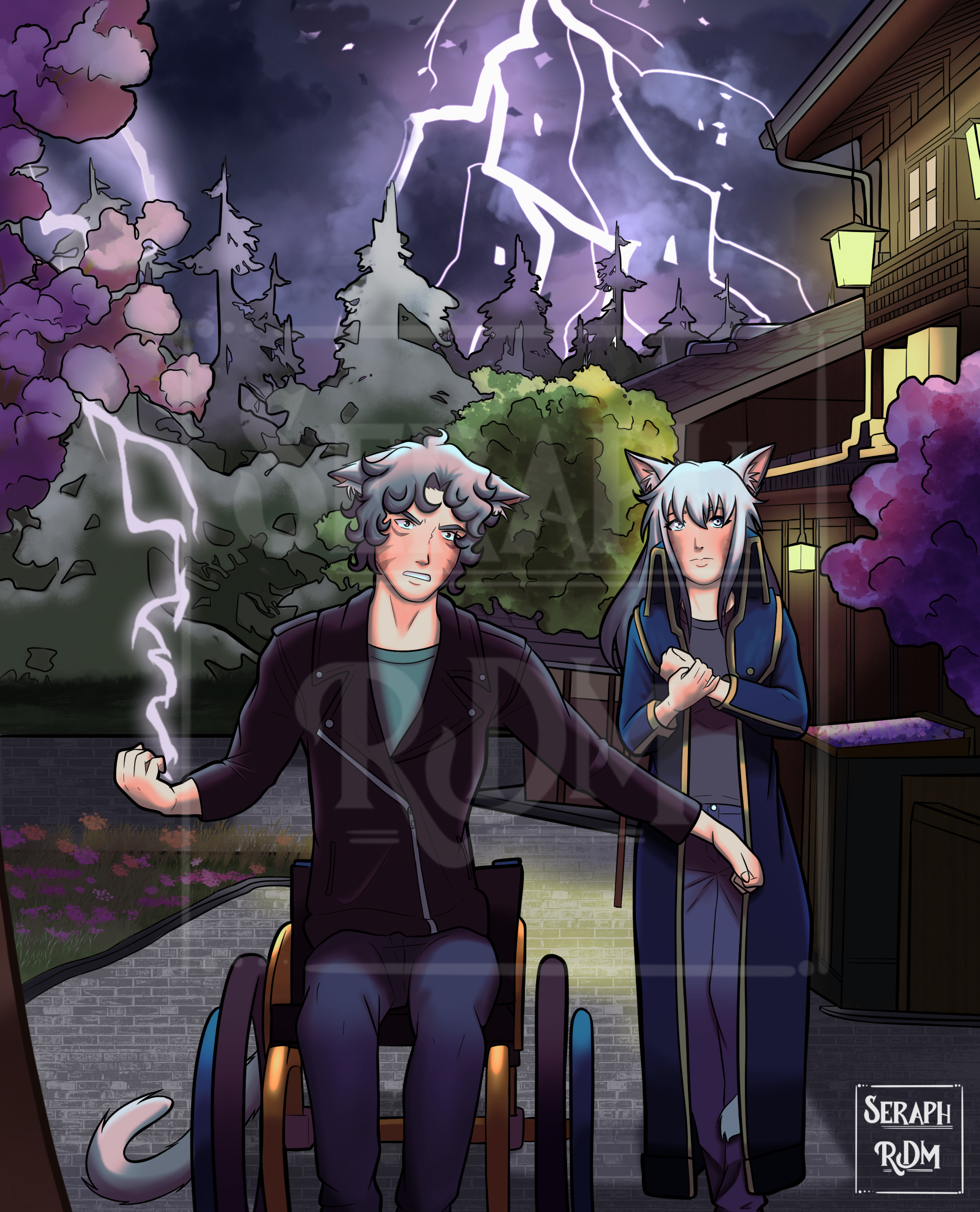 Alt Text: A drawing of Kaedan and Inarora together. Kaedan is in his wheelchair, with one arm out keeping Inarora back and the other hand is curled up and it appears there is lightning striking it or coming from the hand. Inarora is behind his arm and she's awkwardly holding her wrists, glancing to the side with nervousness. Behind them is a scene in Erazim, and in the distance shows a lightning storm.