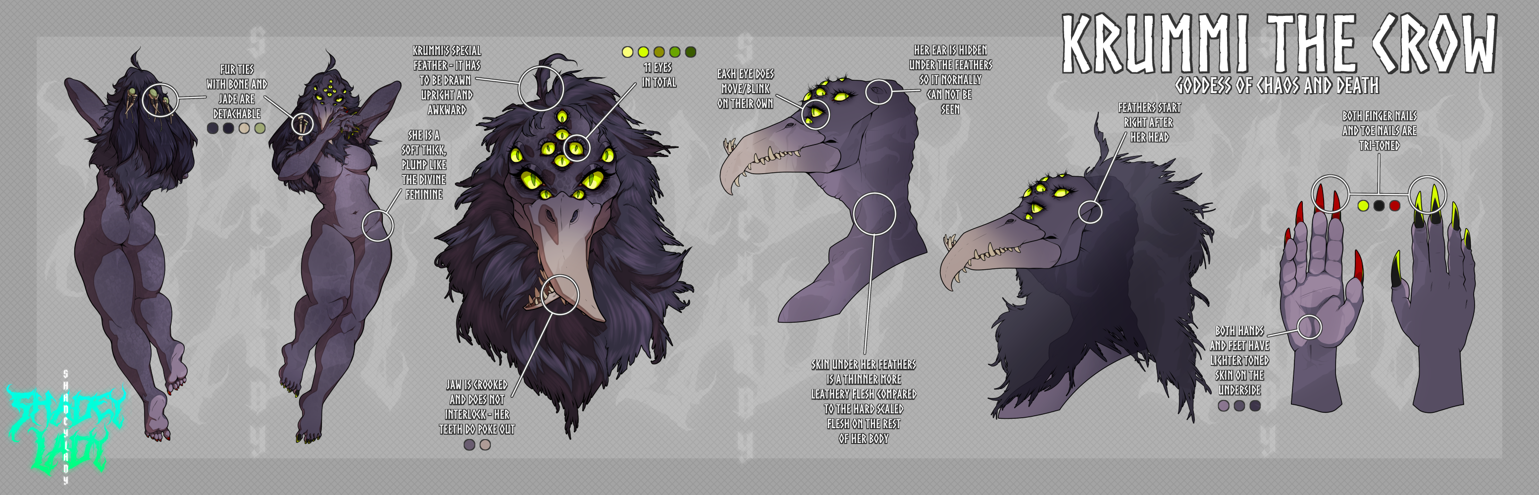 ≻─── ⋆⊱༻⚪༺⊰⋆ ───≺ Krummi the Crow Goddess of Chaos and Death ≻───── ⋆☽⋆ ─────≺ Updated design for Krummi/her first ref sheet [LinkTree](https://linktr.ee/shadeyladyart?utm_source=linktree_admin_share) ≻─── ⋆⊱༻⚪༺⊰⋆ ───≺0 Comments 0 Shares 13 Views -