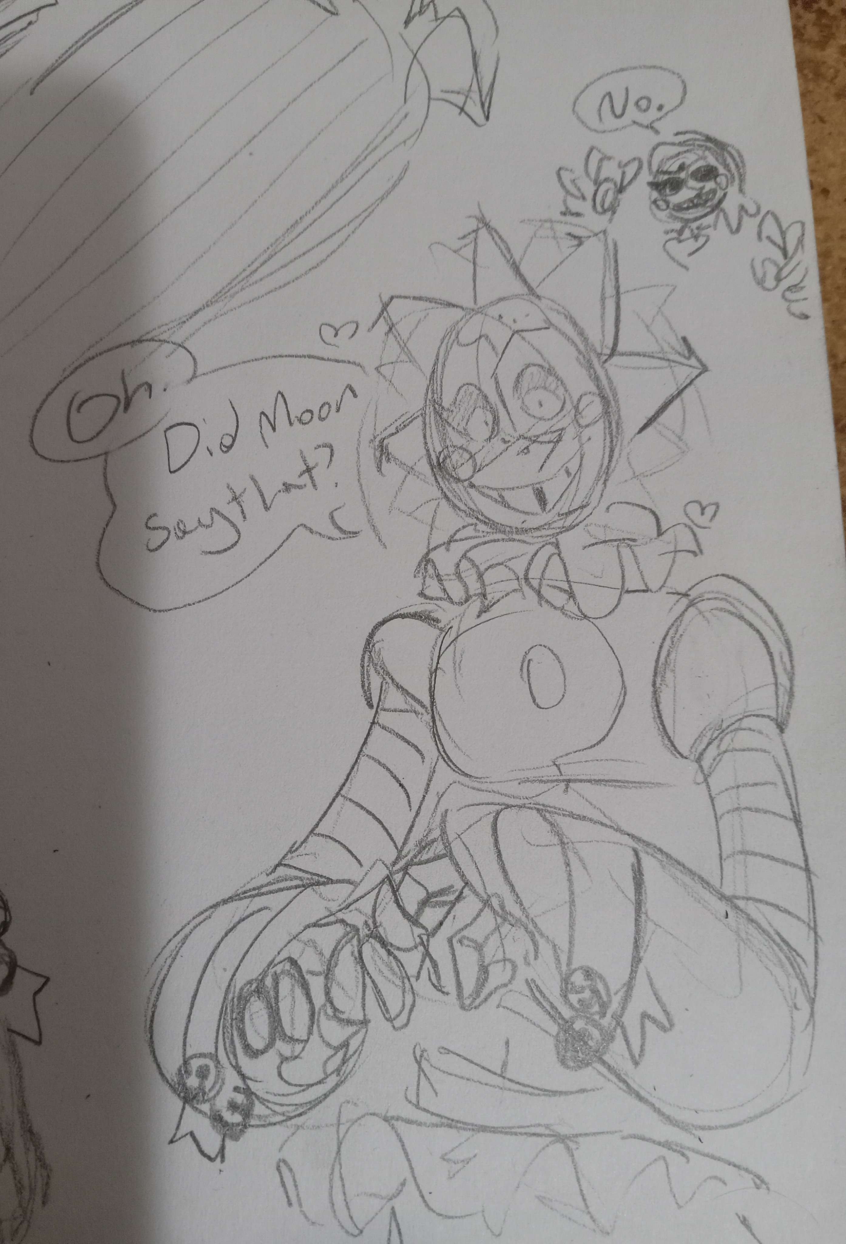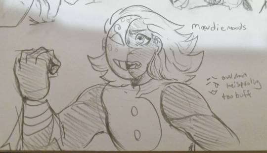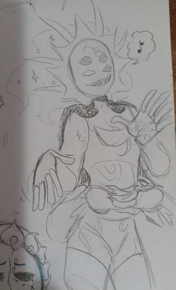 [ID: Pencil sketch of soul eater Sun raising a loose fist with a moon mask and perturbed expression. There’s a small side note saying “aw man, he’s prolly too buff” End ID]