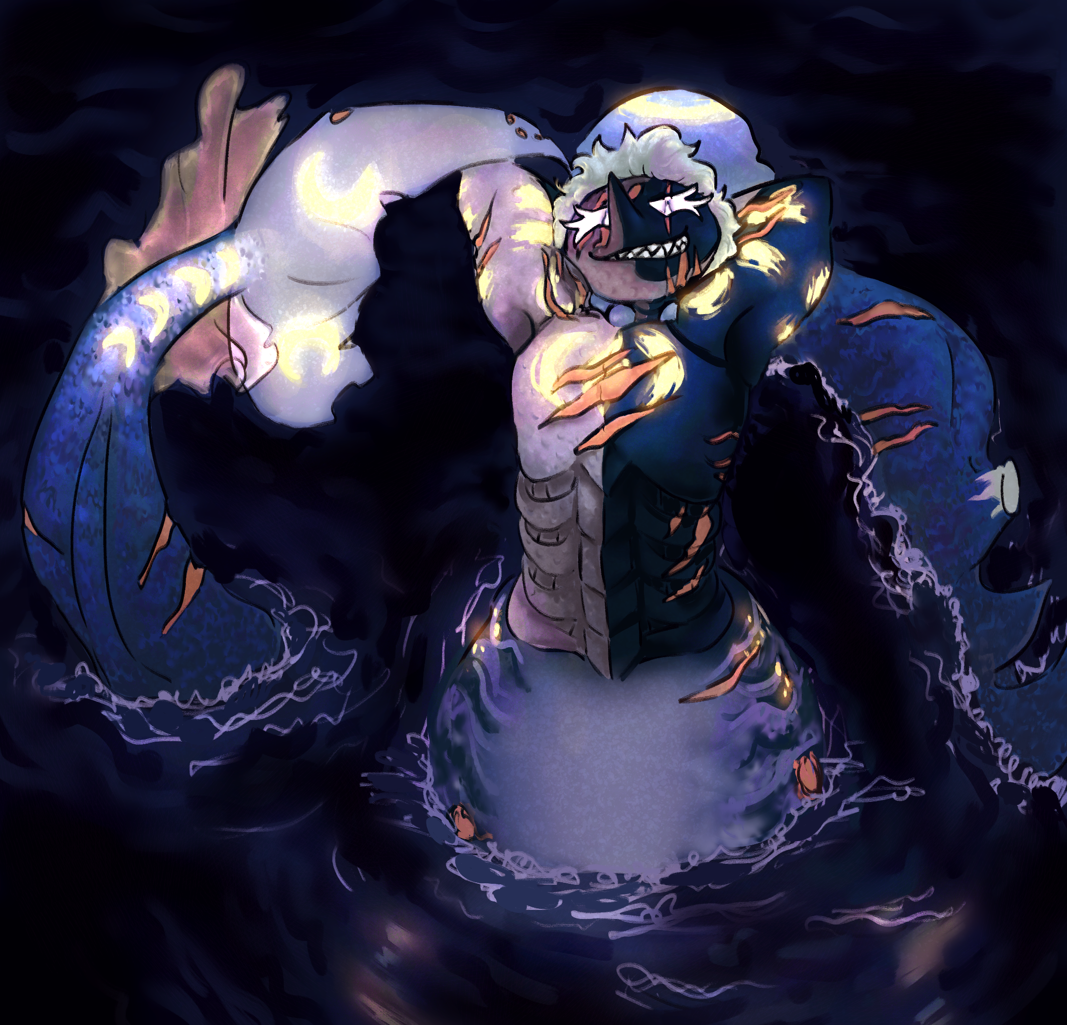 [ID: Siren Moon from Ocean AU in dark water, with very strong glowing bits and scars. End ID]