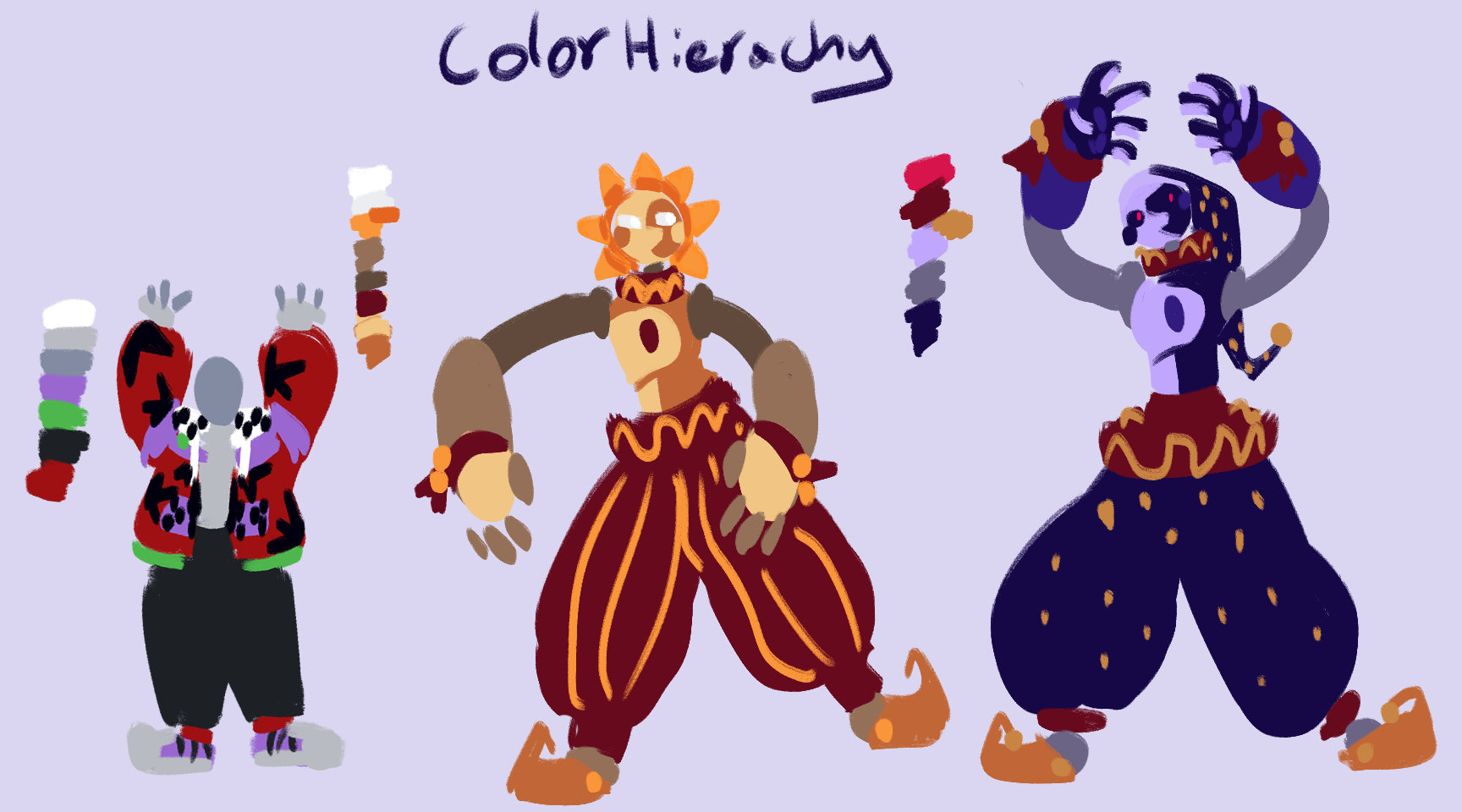 [ID: Y/n, Sun, and Moon made up of blocks of color, with the words “Color Hierarchy” above them. Y/n has their arms raised and’s wearing a roxy themed hoodie, sun’s standing awkwardly, and moon’s raising his arms like a creature. End ID]