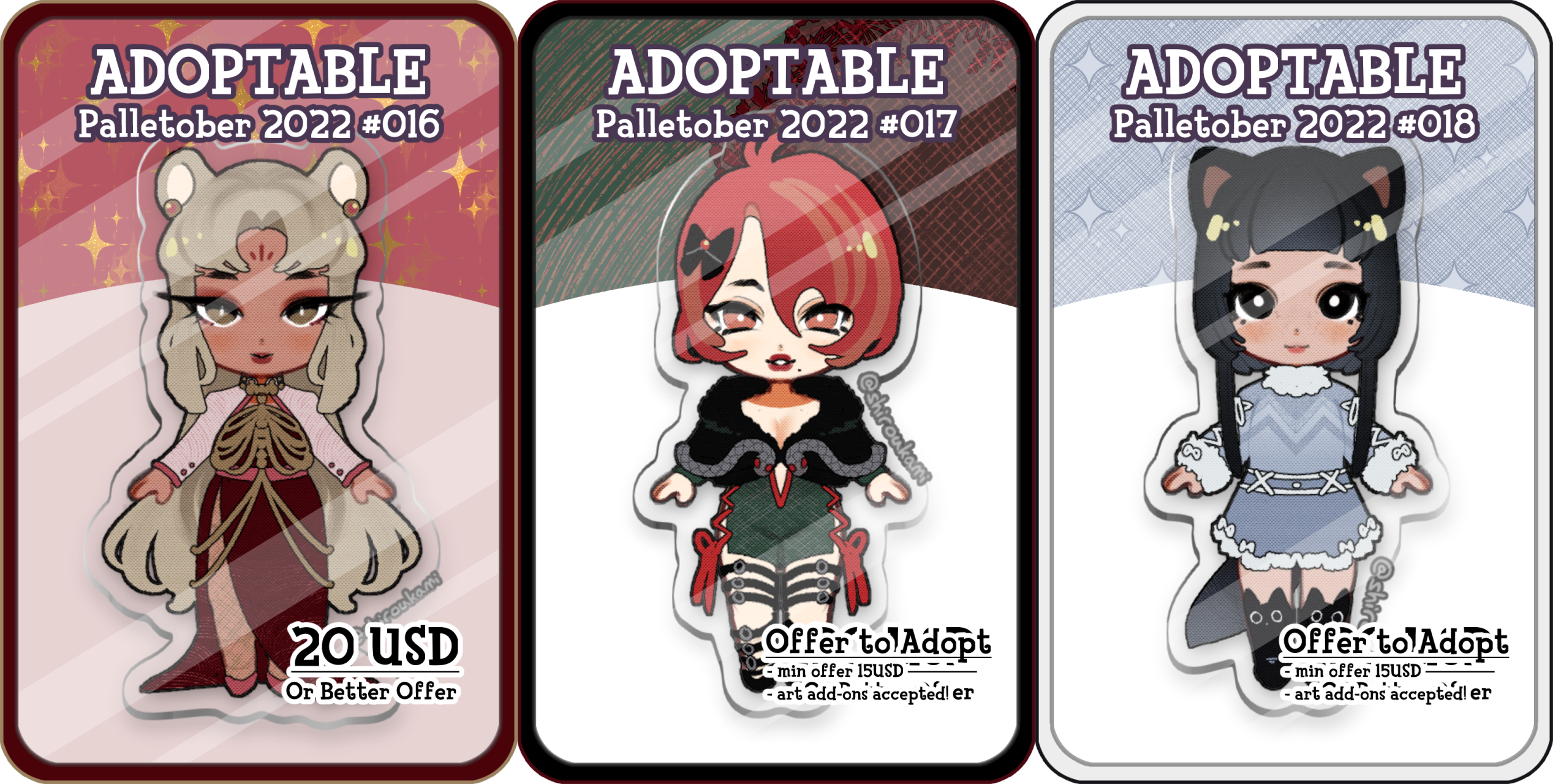all claimed on discord! posting for consistency afdsda ══════════════════════ ✧ Claim on [Discord](https://discord.gg/GsmMCVB) or [Toyhouse](https://toyhou.se/~forums/5866.design-marketplace/353975.-open-shirou-s-palletober-adopts-2022)0 Comments 0 Shares 3 Views